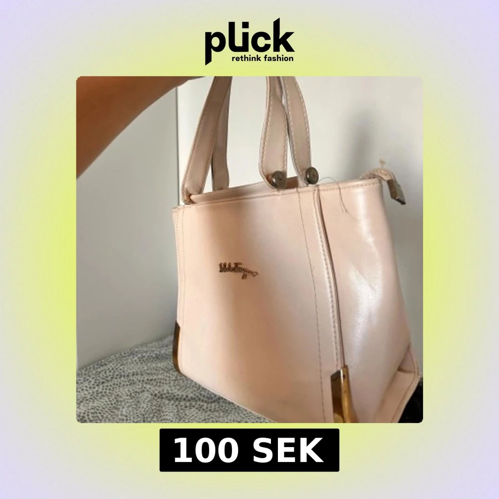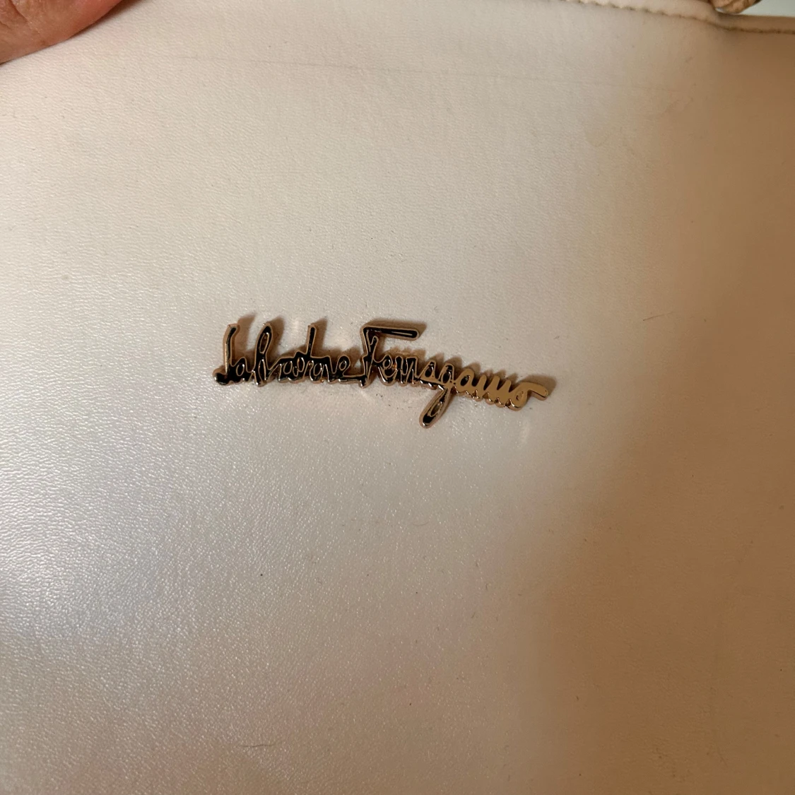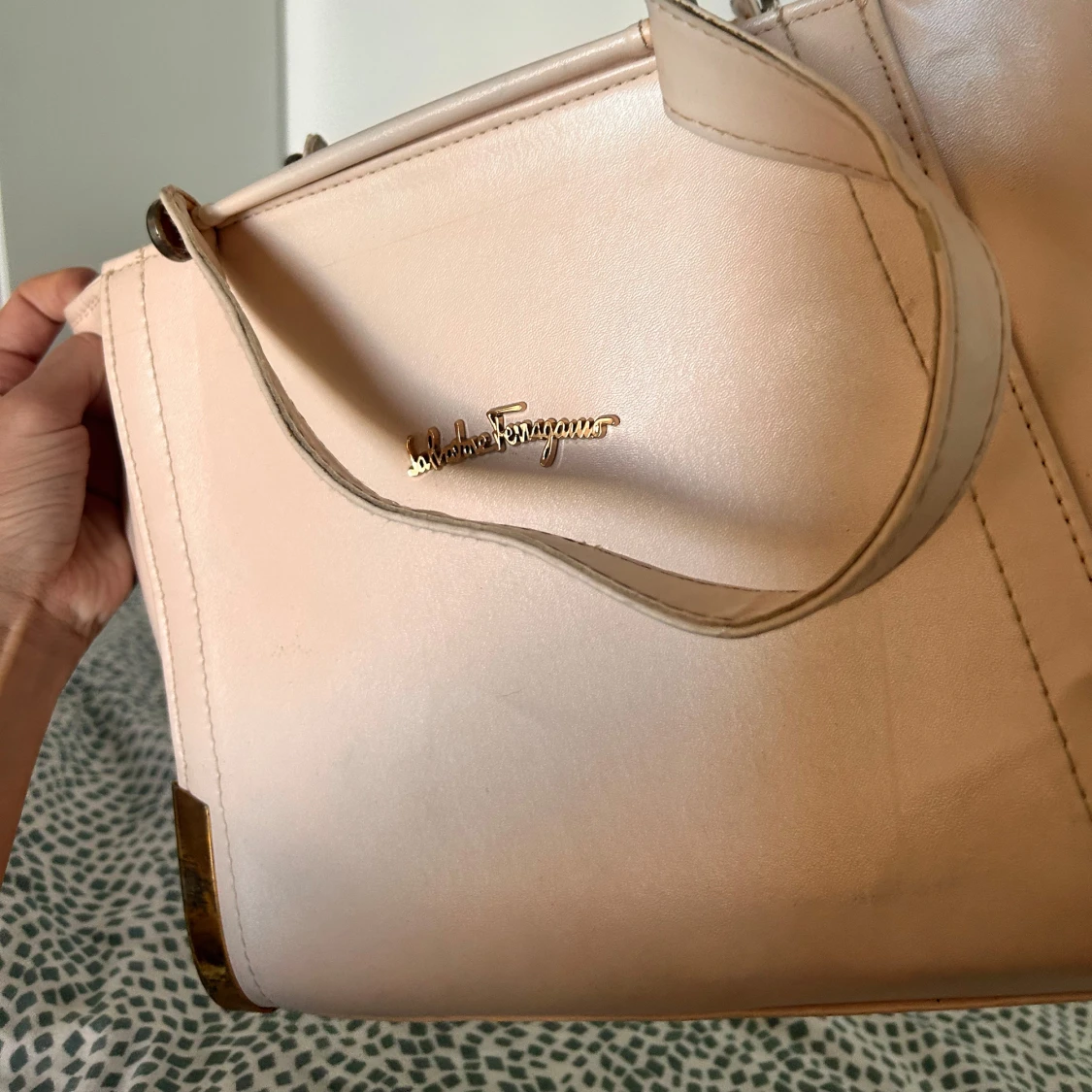 Snygg ljusrosa handväska från Salvatore Ferragamo i skinn med guldiga metalldetaljer och logga framtill. Väskan har två handtag och ett rymligt innerfack med mönstrat foder och dragkedja. Perfekt för dig som vill ha en stilren och klassisk look.