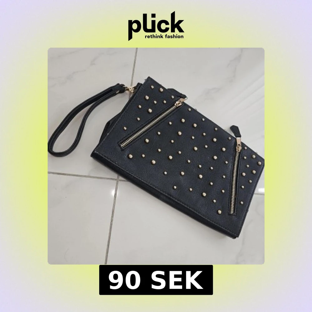 Snygg svart kuvertväska med guldfärgade nitar och två dragkedjor på framsidan. Väskan har en handledsrem och är tillverkad i skinnimitation. Perfekt för att ge din outfit lite edge och att bära det viktigaste.