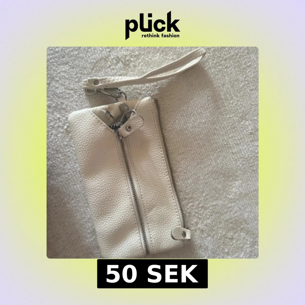 Snygg vit kuvertväska i präglat skinn med silverfärgade detaljer och praktisk handledsrem. Väskan har två dragkedjor framtill och en smart nyckelring på insidan. Perfekt för att hålla ordning på småsaker och nycklar.