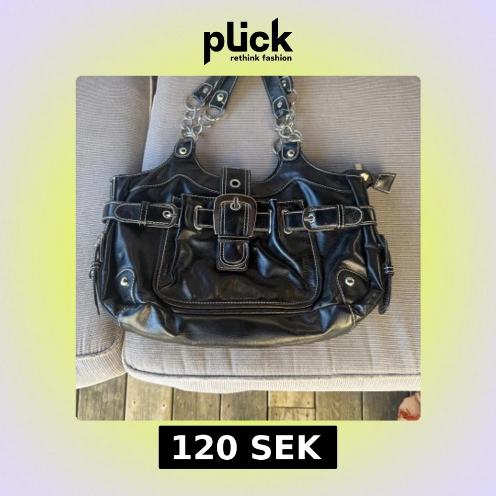 Cool svart handväska från Snooke i skinnimitation med silvriga kedjor på axelbanden och snygga spänndetaljer framtill. Väskan har vita kontrastsömmar, dragkedja upptill och flera fack för småprylar. Perfekt för dig som gillar statement-accessoarer.