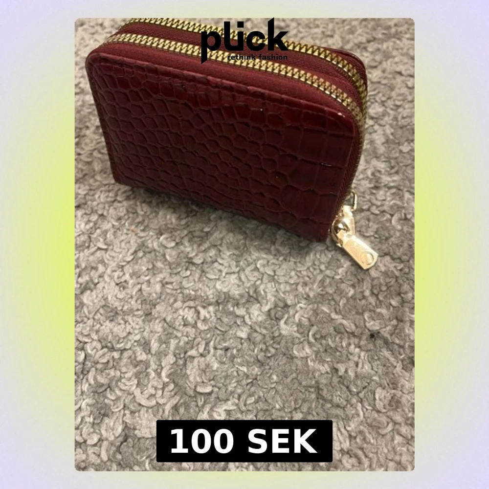 Snygg vinröd plånbok med krokodilpräglat mönster och dubbla guldfärgade dragkedjor. Plånboken är kompakt och har en lyxig känsla tack vare det glansiga skinnmaterialet. Perfekt för kort och mynt.