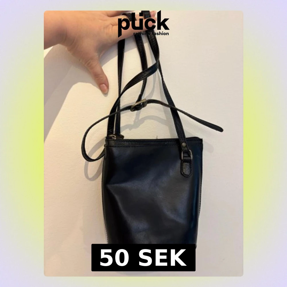 Snygg svart axelväska i skinn med stilren bucket-form och justerbar rem. Väskan har metallspännen och en minimalistisk design som passar till många olika outfits. Perfekt storlek för det viktigaste och enkel att slänga över axeln.
