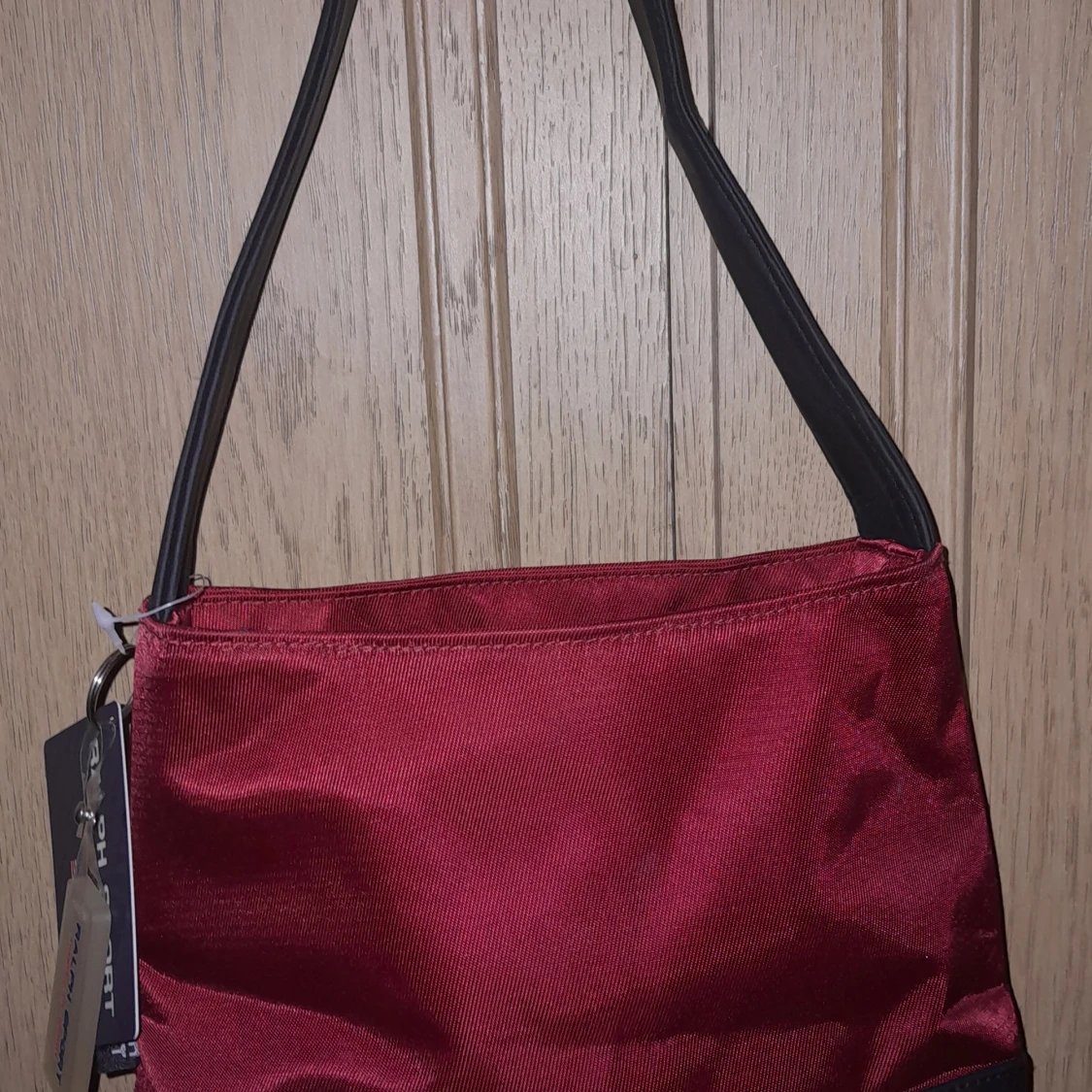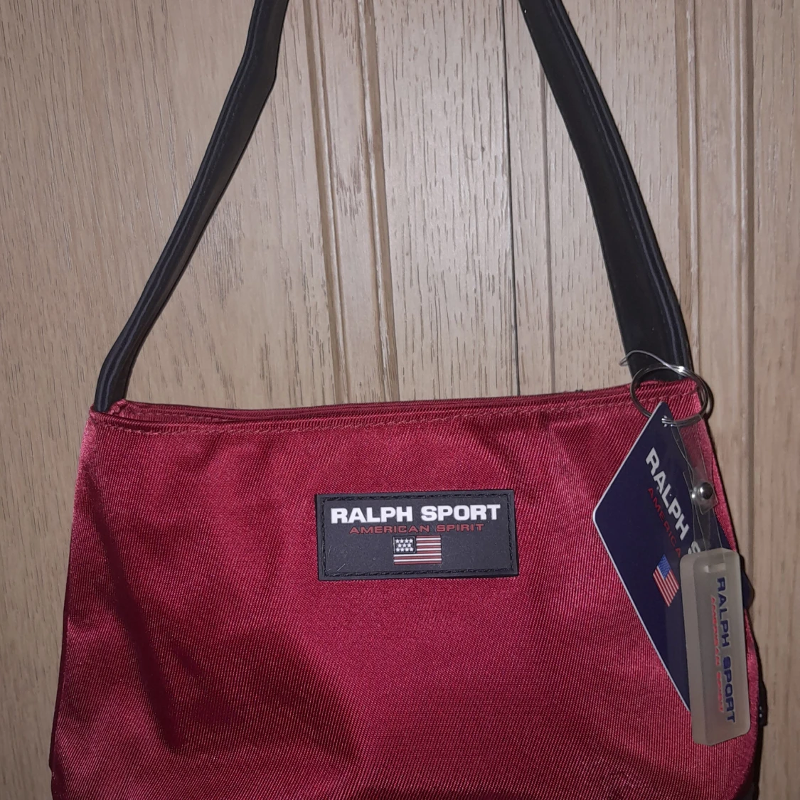 Snygg röd axelväska från Ralph Lauren Sport med svart axelrem. Väskan har en stilren design med en logotyp på framsidan. Perfekt för att bära dina dagliga nödvändigheter med stil.