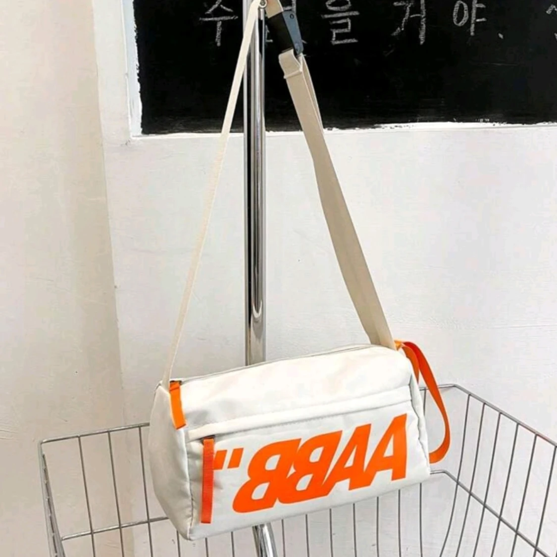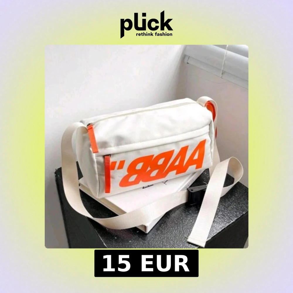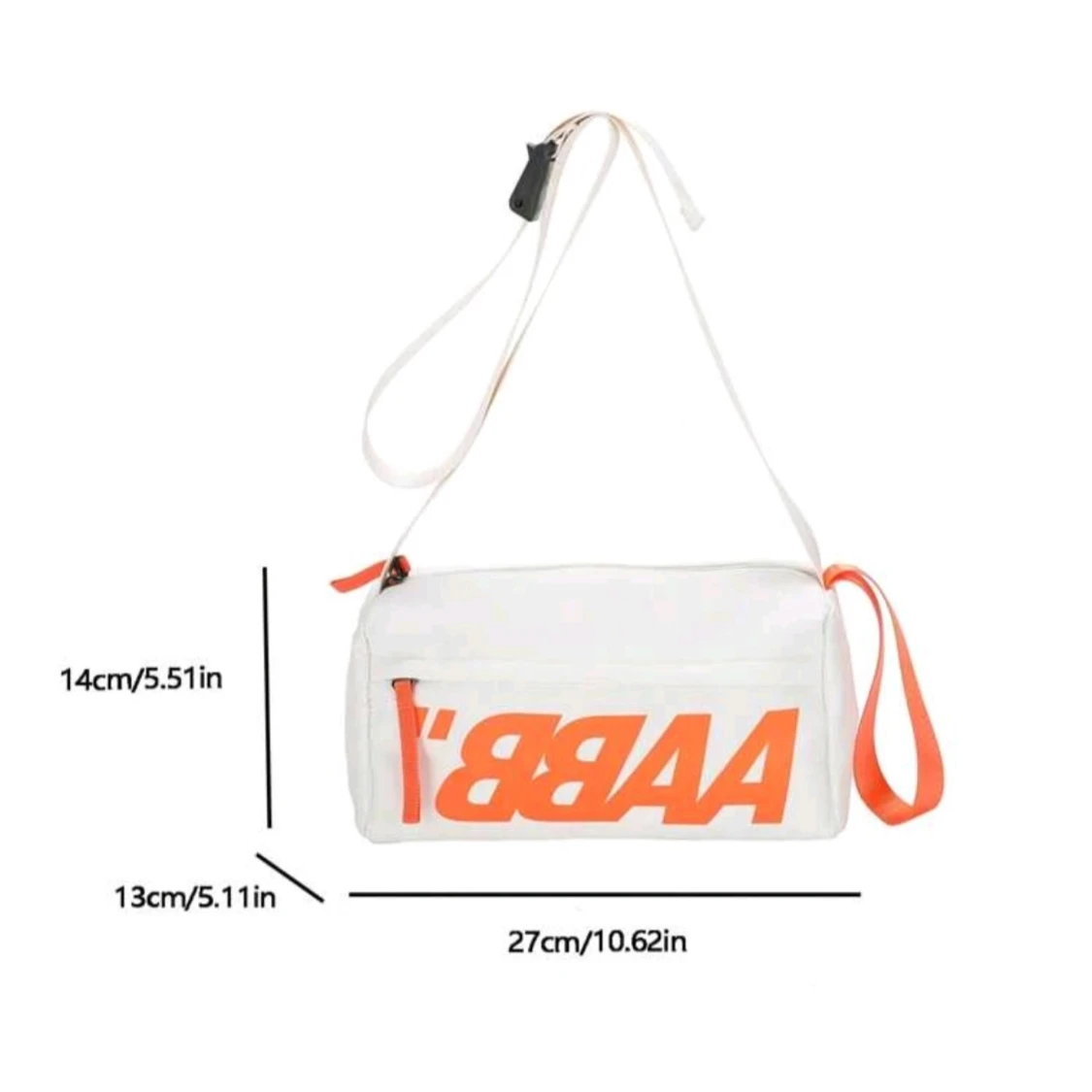 Cool vit axelväska med stort orange tryck på framsidan och matchande orange detaljer vid dragkedjorna. Väskan har justerbar rem och praktisk rektangulär form, perfekt för att bära med sig det viktigaste. Tillverkad i slitstark polyester.