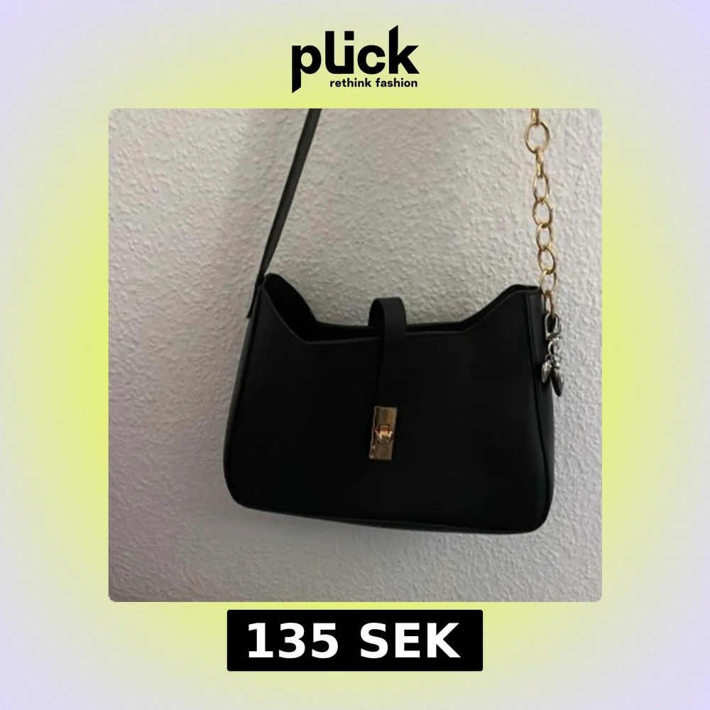 Stilren svart axelväska i syntetmaterial med guldfärgad kedja och låsdetalj framtill. Väskan har en minimalistisk design med raka linjer och en smidig axelrem. Perfekt för dig som gillar en clean look med en touch av guld.