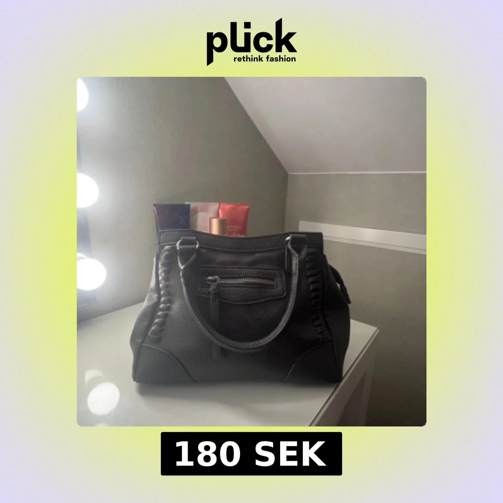 Snygg svart handväska i skinn med dragkedja framtill. Väskan har två handtag och dekorativa sömmar längs sidorna. Perfekt för en stil ren look