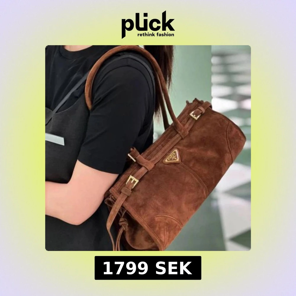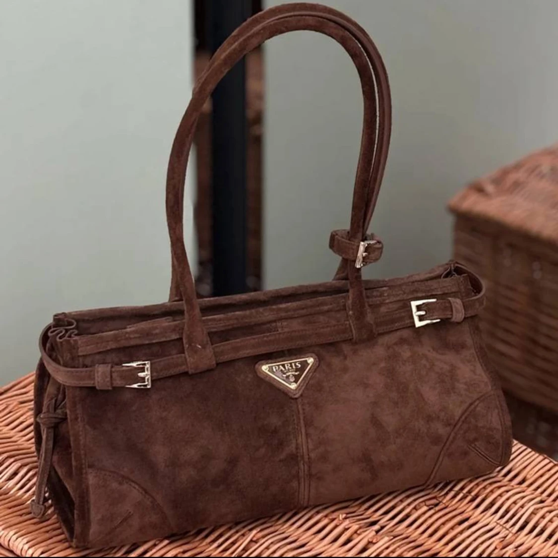 Snygg brun axelväska i mocka med guldiga spännen och detaljer. Väskan har en avlång form, dubbla handtag och en klassisk Paris-logga framtill. Perfekt för dig som vill ha en trendig och stilren accessoar med vintagekänsla.