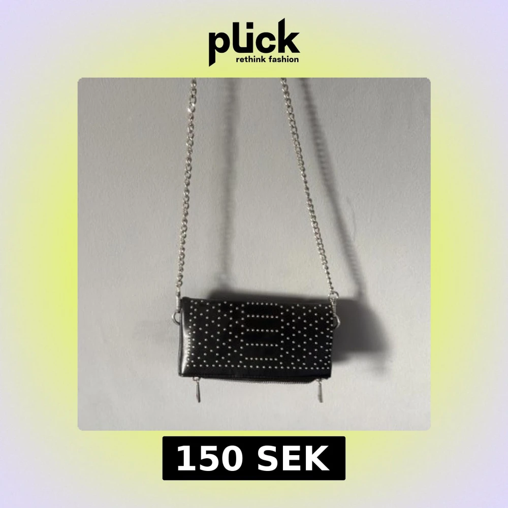 Säljer en svart axelväska i syntet med silverfärgade nitar på framsidan och en lång kedjerem. Väskan har dubbla dragkedjor och en stilren, rektangulär form. Perfekt för dig som gillar edgy detaljer och vill ha en snygg accessoar till din outfit.