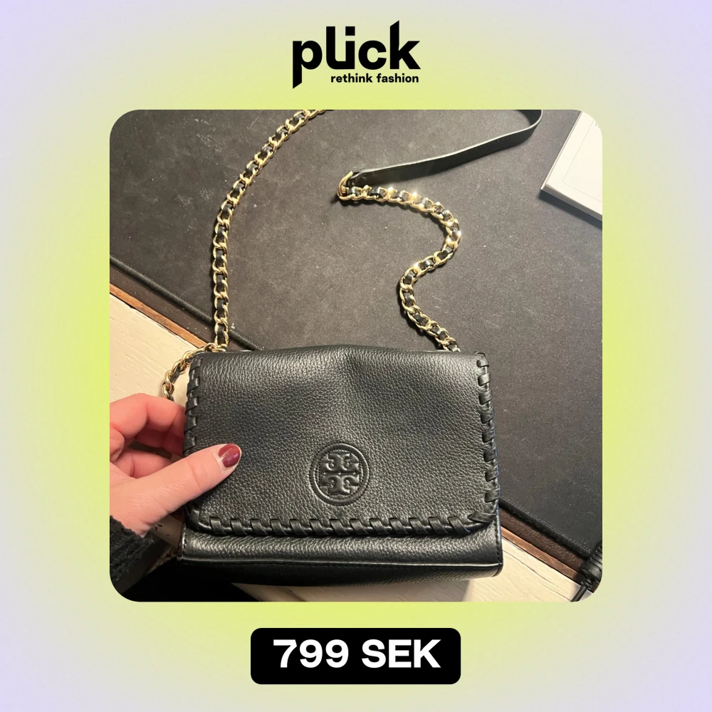 Snygg svart axelväska i skinn med en elegant kedja som axelrem. Väskan är i skinn och har dekorativa sömmar längs kanterna. Perfekt för både vardag och fest! 🖤