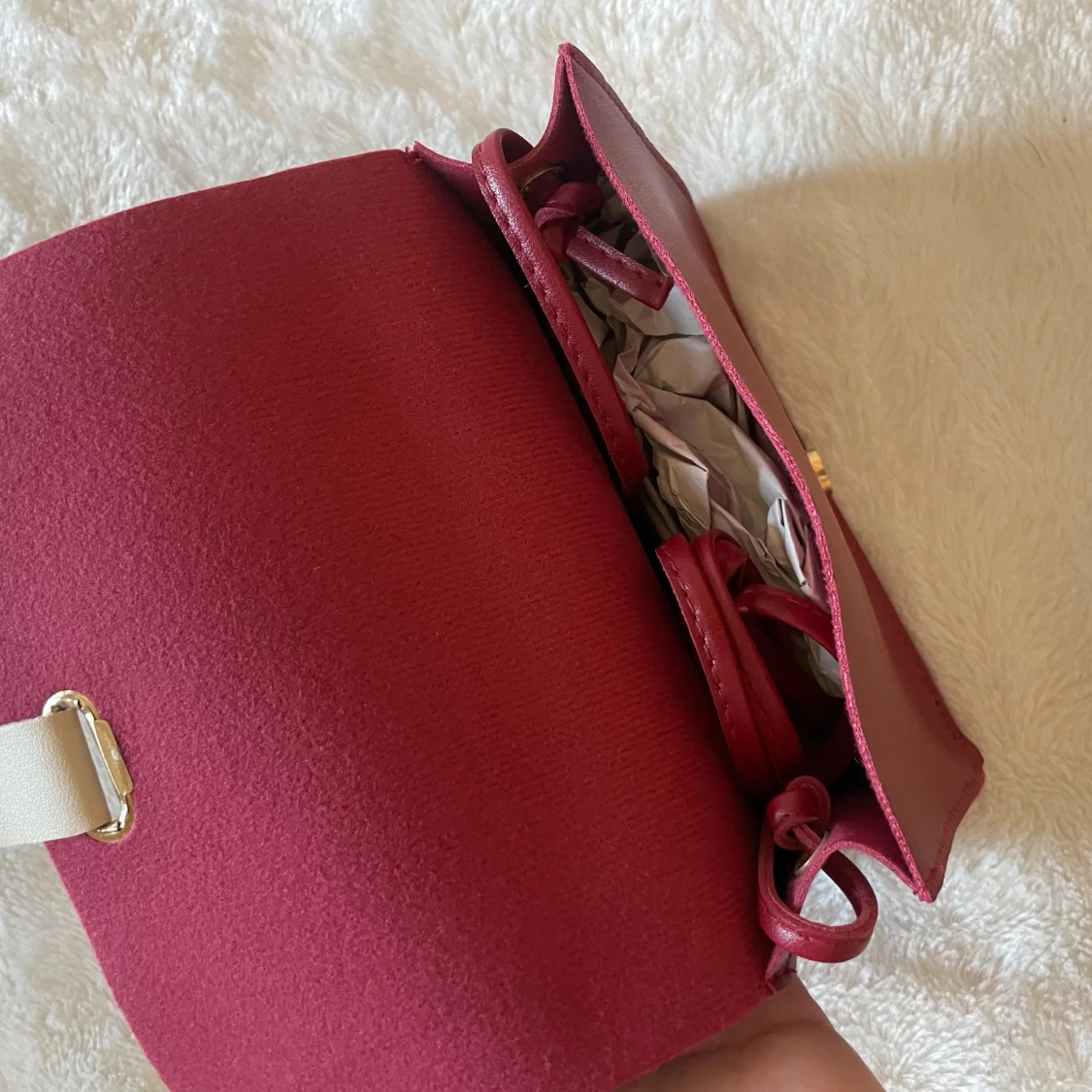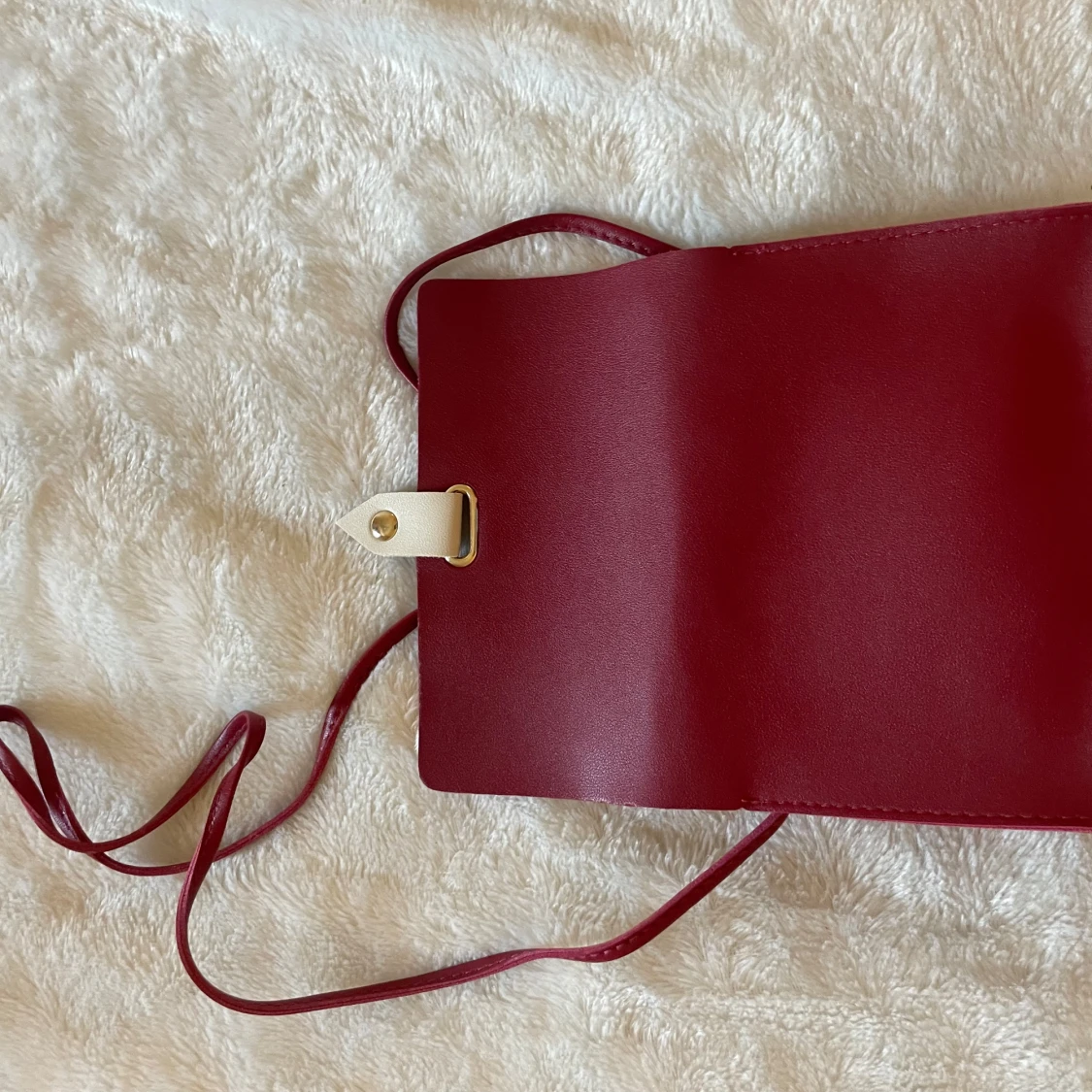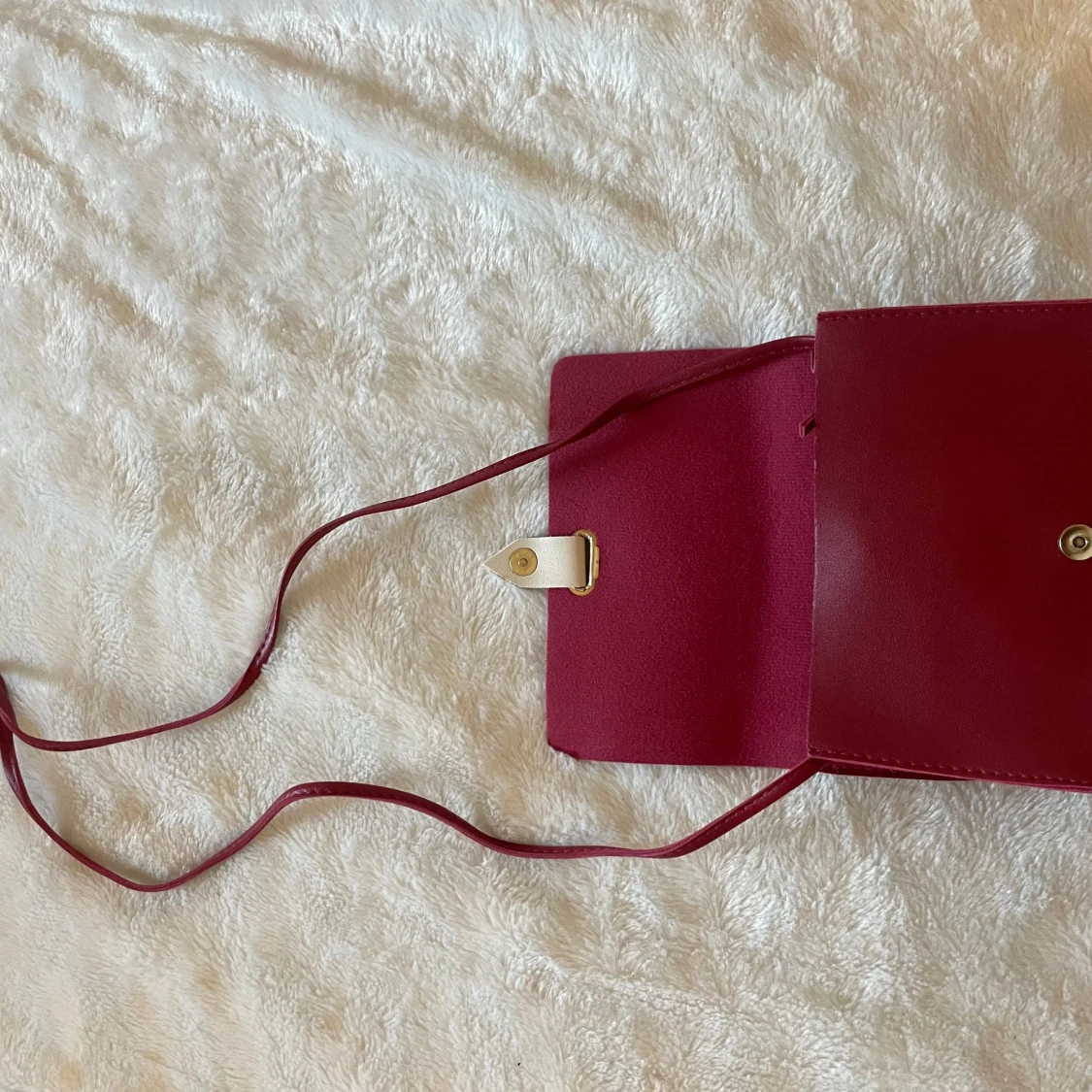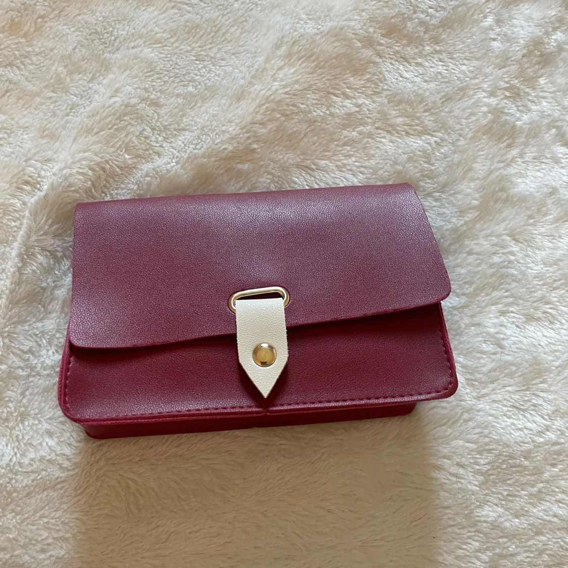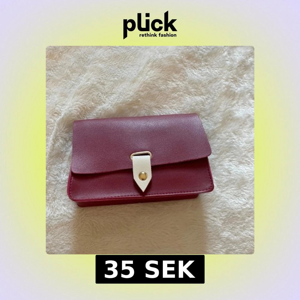 Säljer en stilren vinröd axelväska med guldfärgad knapp. Väskan har ett minimalistiskt och modernt utseende, perfekt för att bära det viktigaste. Materialet är slätt och väskan har en kompakt form.