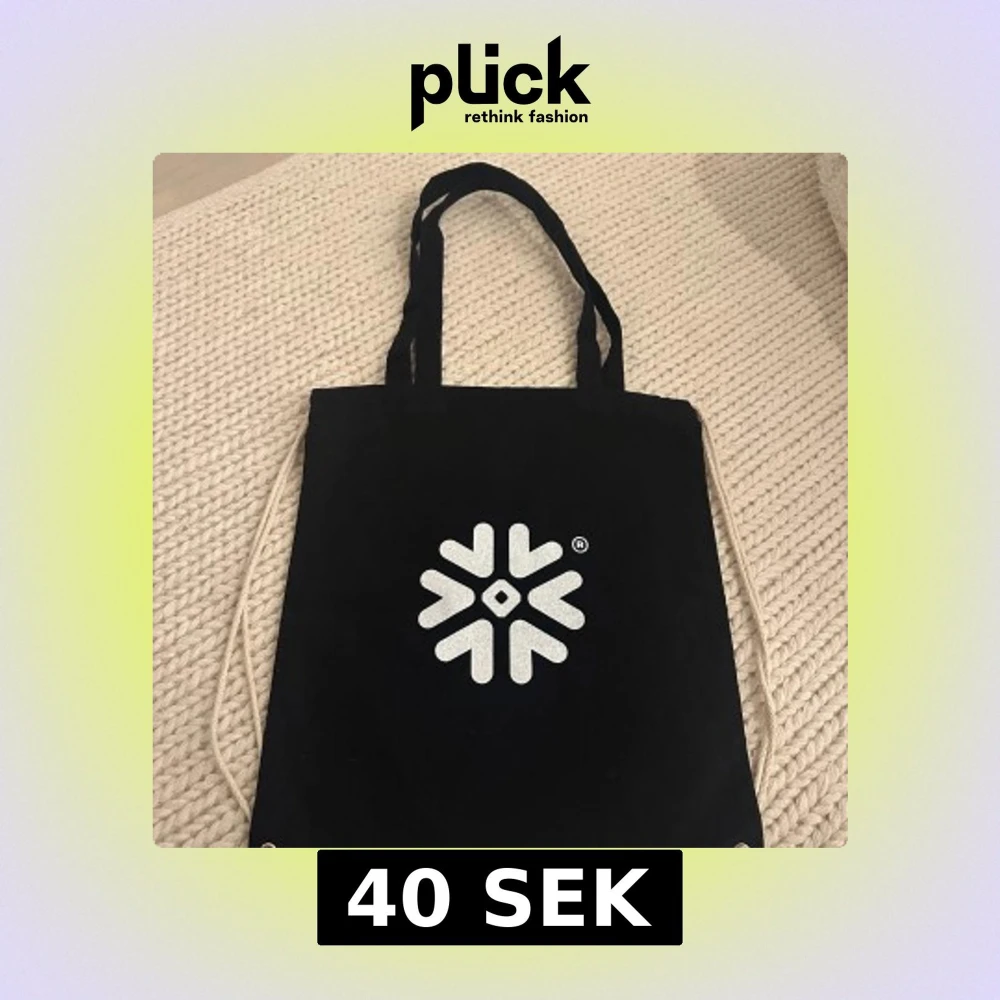 Säljer en svart tygpåse med vitt snöflingeliknande tryck på framsidan. Väskan har både handtag och snören för att kunna bäras som ryggsäck. Perfekt för att bära böcker eller småsaker.