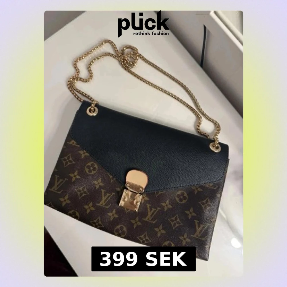 Snygg handväska med klassiskt monogrammönster i brunt och guld. Väskan har svart lock i läder, guldfärgad kedjerem och elegant låsdetalj framtill. Röd på insidan❤️