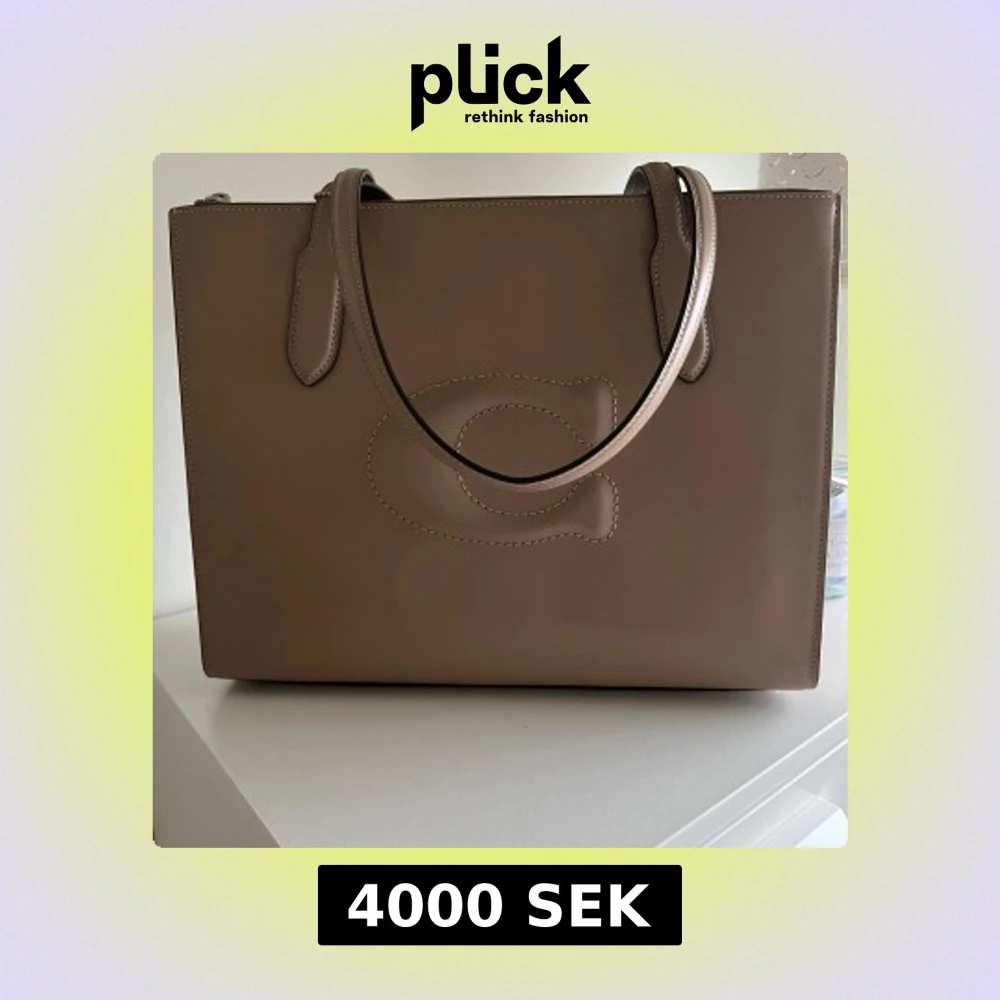 Stilren beige handväska från Coach i slätt skinn med präglad C-logga på framsidan. Väskan har två smala handtag, dragkedja upptill och en klassisk tag med Coach-logga. Perfekt för dig som gillar minimalistisk och lyxig design.