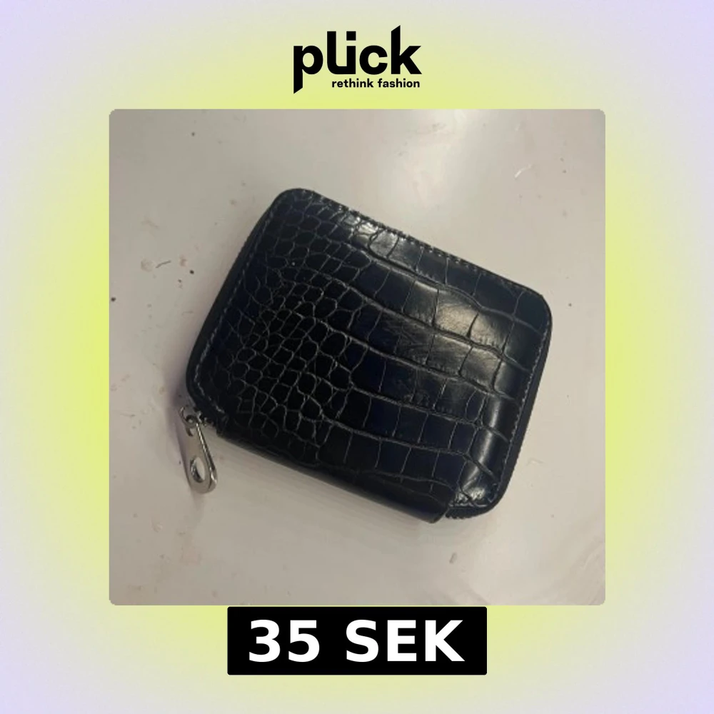 Snygg svart plånbok i croco-mönstrat skinn med dragkedja runtom. Plånboken har flera fack för kort och mynt, samt en silverfärgad dragkedja och metallhake. Perfekt storlek för att ha med sig överallt.