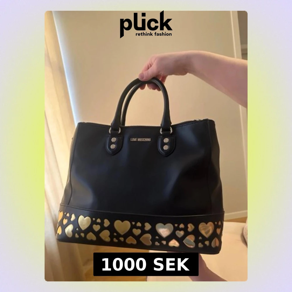 Säljer en svart handväska från Love Moschino med två stadiga handtag och dragkedja upptill. Väskan har en dekorativ kant med guldiga hjärtan längst ner som ger en unik och cool vibe. Materialet är skinn och detaljerna är i metall. Perfekt för dig som gillar statement-accessoarer.