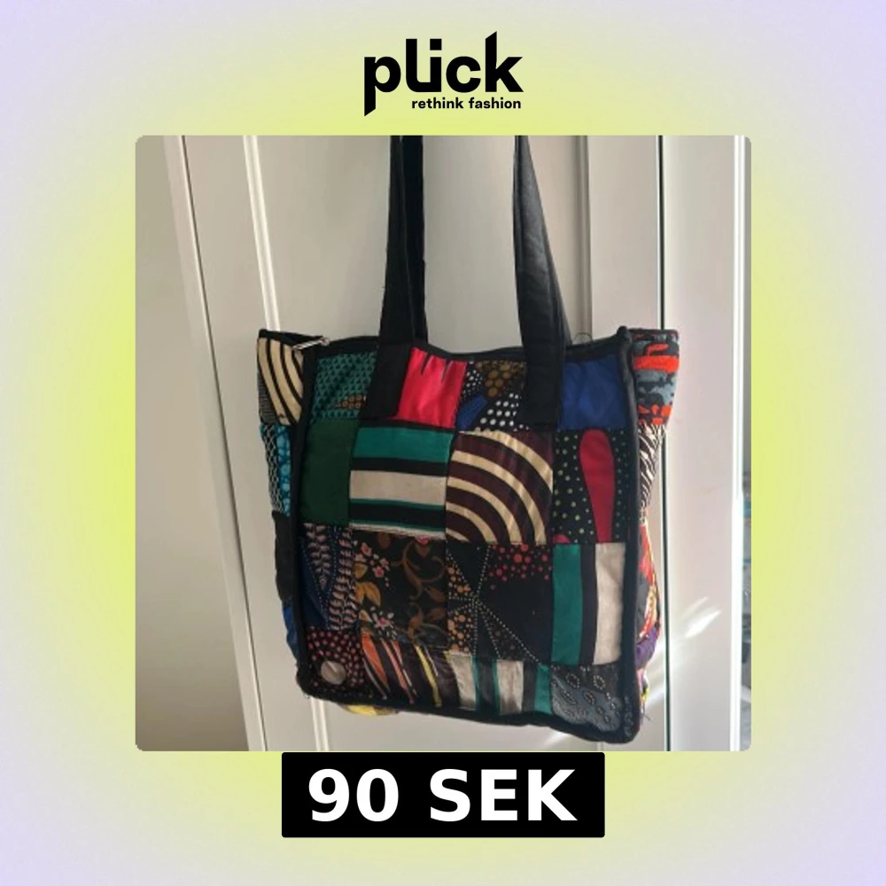 Säljer en unik och färgglad patchwork shoppingväska med olika mönster och färger. Väskan har svarta handtag och en dragkedja för säker förvaring. Perfekt för att ge din outfit en bohemisk touch!