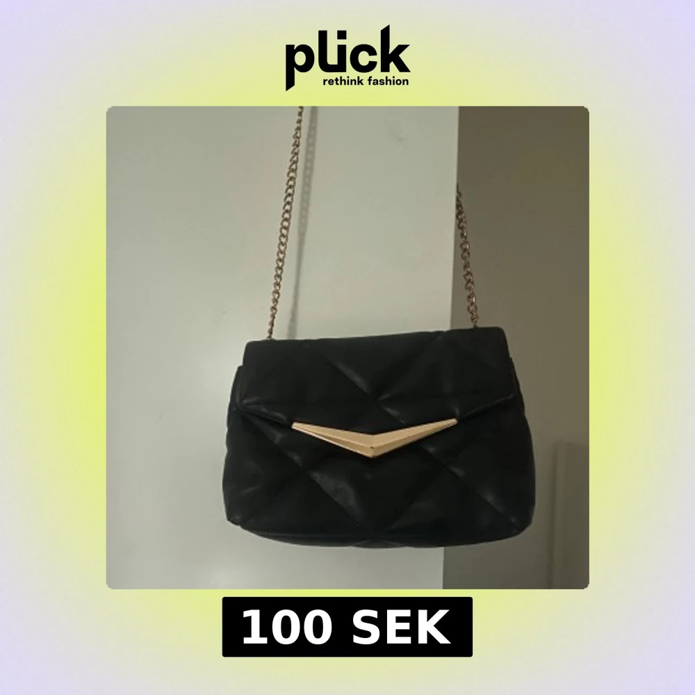 Snygg svart axelväska med quiltat mönster och guldfärgad kedja. Väskan har en elegant design med en dekorativ guldfärgad detalj på framsidan. Perfekt för att ge din outfit en stilfull touch.