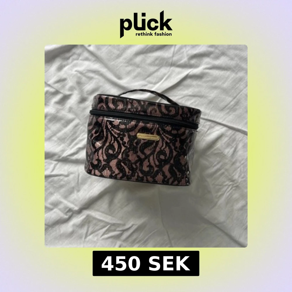 Säljer en snygg necessär från Victoria's Secret med svart spetsmönster över rosa botten. Väskan har dragkedja med guldfärgad detalj och ett praktiskt handtag upptill. Perfekt för smink eller småprylar.
