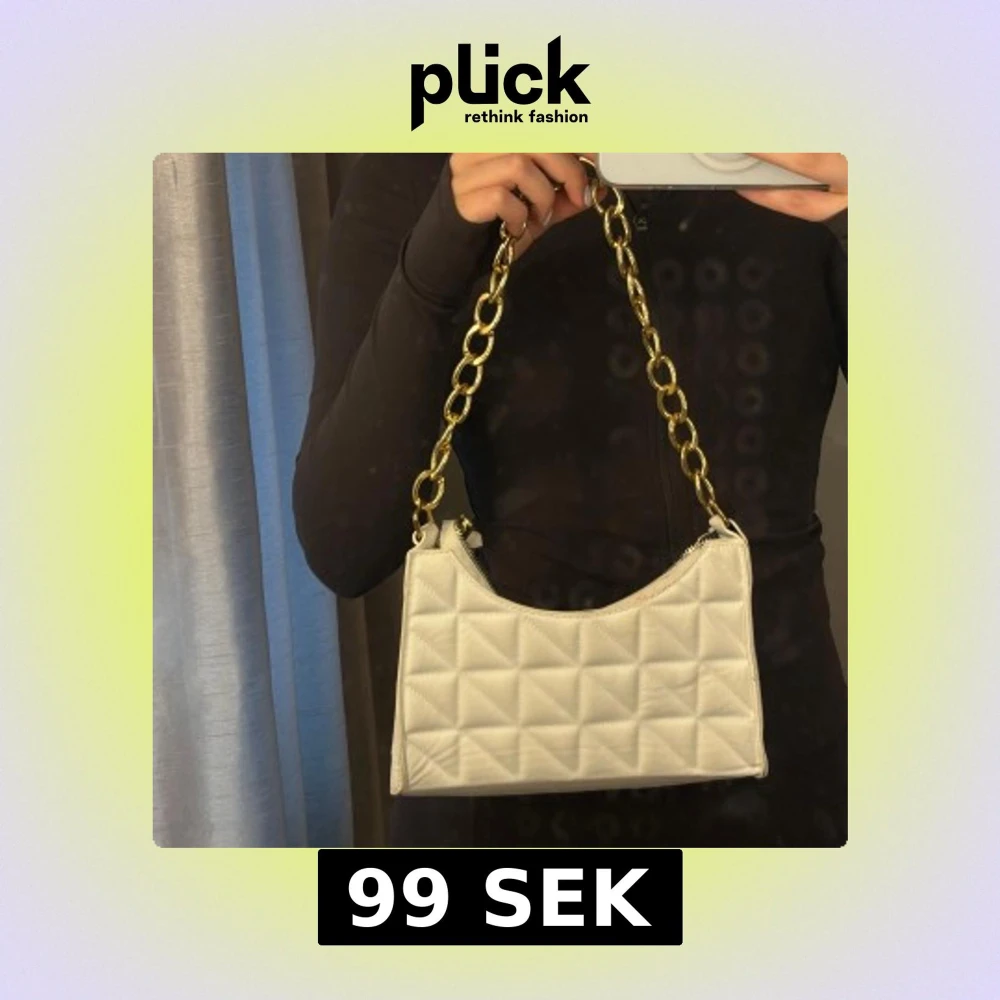Säljer en snygg vit axelväska med quiltat mönster och en chunky guldfärgad kedja som axelrem. Väskan har dragkedja upptill och en stilren, modern look som passar till många outfits.