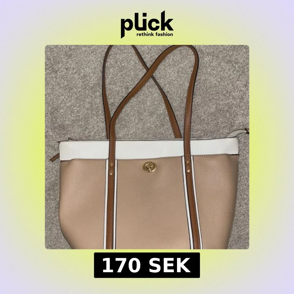 Snygg axelväska i beige och vitt skinn med bruna axelremmar. Väskan har guldfärgad vridknapp och dragkedja upptill. Stilren design med kontrasterande färgpaneler och detaljer i guld. Perfekt storlek för att få plats med allt du behöver.