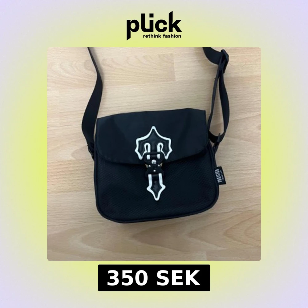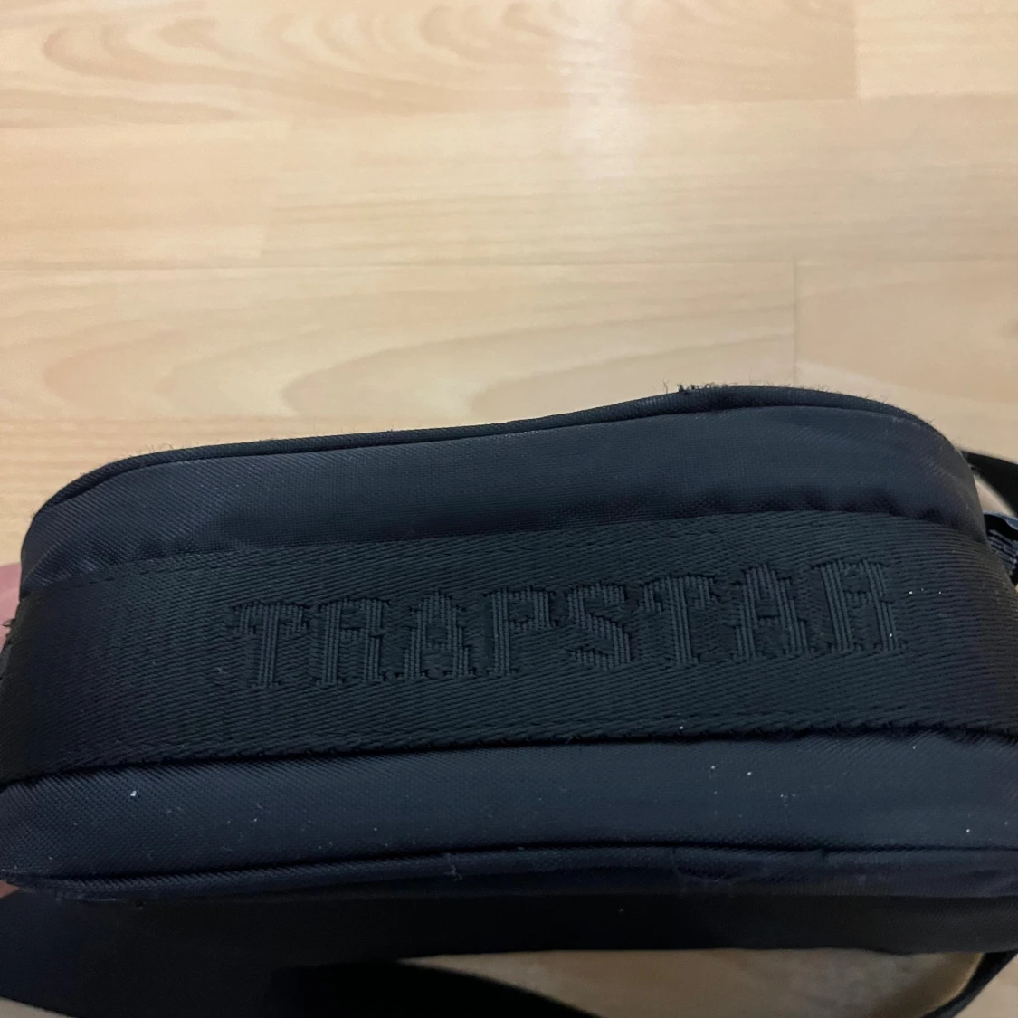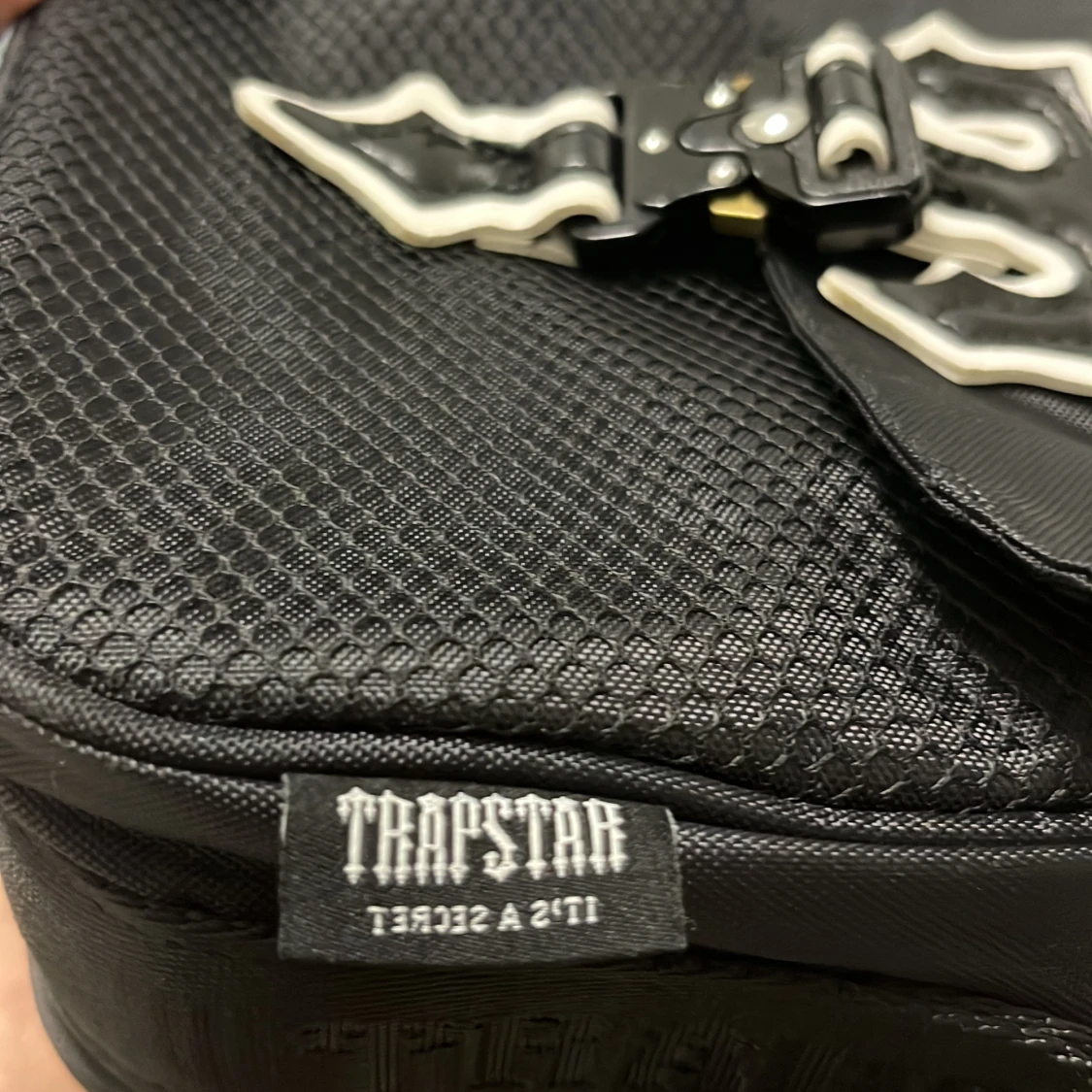 Säljer en svart axelväska från Trapstar med unik vit och svart spänndetalj på locket. Väskan har en justerbar rem och textur i materialet som ger en cool vibe. Märket syns tydligt på både rem och etikett. Perfekt för att bära dina essentials.