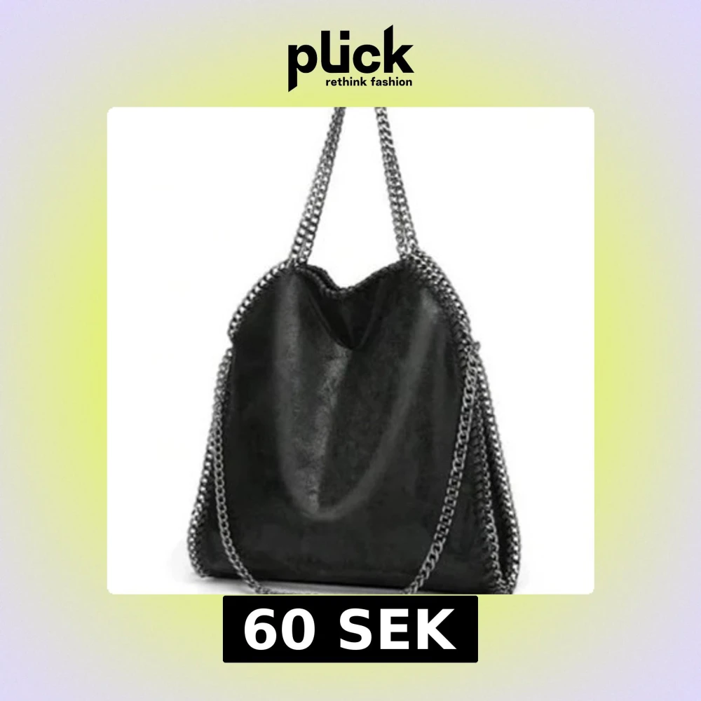 svart axelväska med silverfärgade kedjor längs kanterna. Den har gått upp litegrann vid vissa trådar men det synns inte så mycket. En kedja är av men två är kvar💕den är från 1 år ungefär tillbaka från temu men använder inte längre. Den rymmer mycket!!