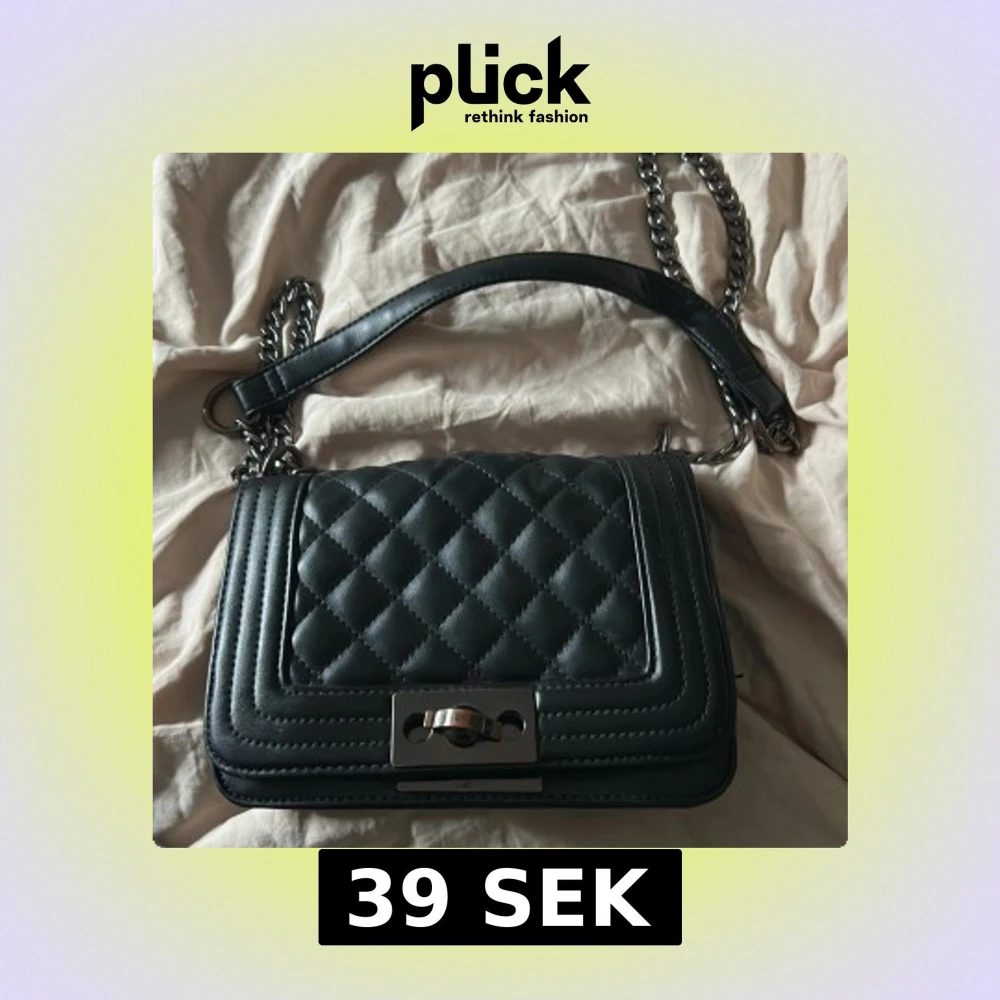 Snygg svart axelväska med quiltat mönster och kedjedetaljer. Väskan har en stilren design med ett metallspänne framtill. Är lite rostigt men inget som märks, låset på framre sidan av väskan är sönder men fungerar fortfarande att stänga!💕väskan köpt ifrån gina men finns ej kvar!☺️
