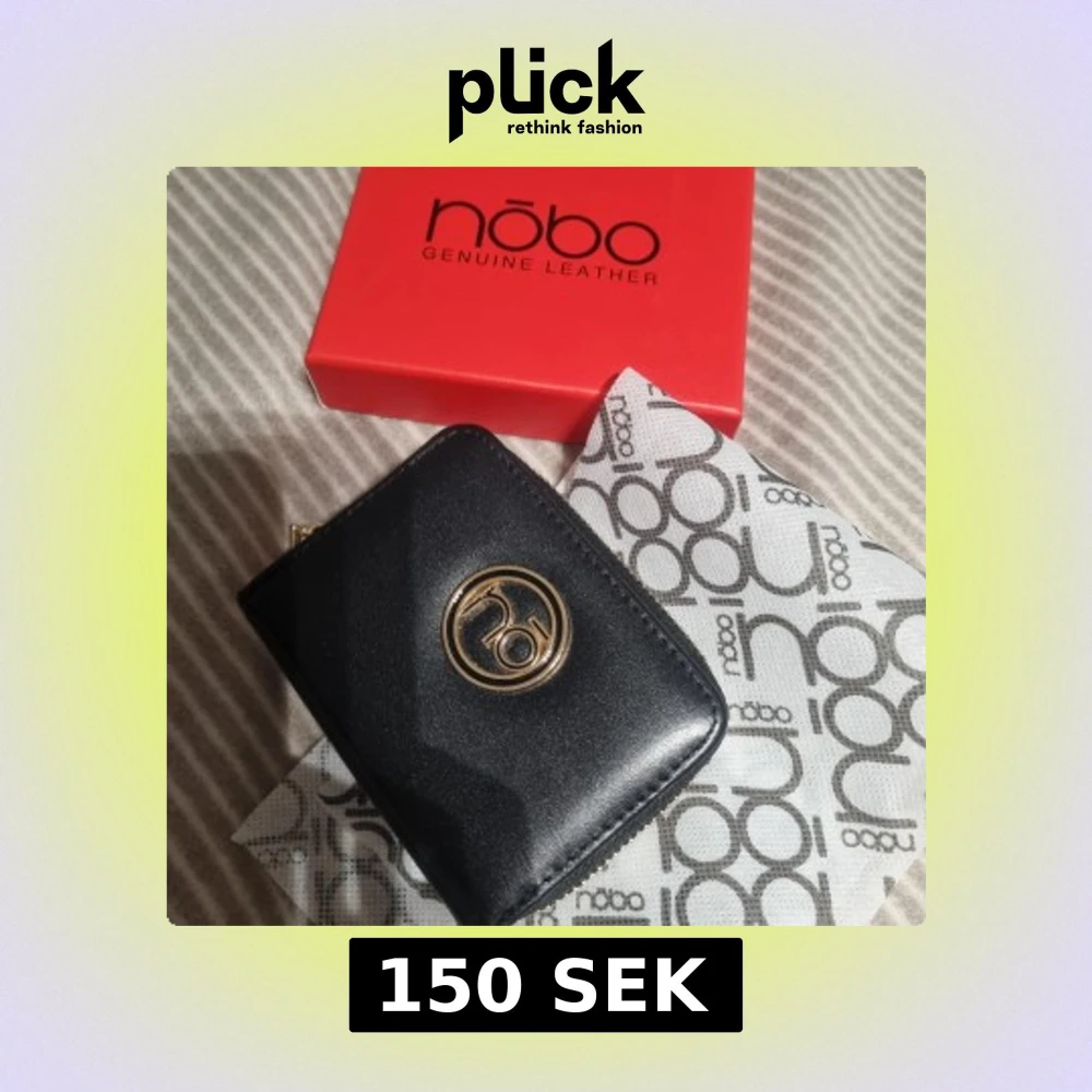 Stilren svart plånbok från Nobo i äkta skinn med guldfärgad logga framtill. Plånboken har dragkedja runtom, flera kortfack och tryckknappsstängning. Perfekt storlek för att få plats med det viktigaste och ändå ha en snygg accessoar i väskan.
