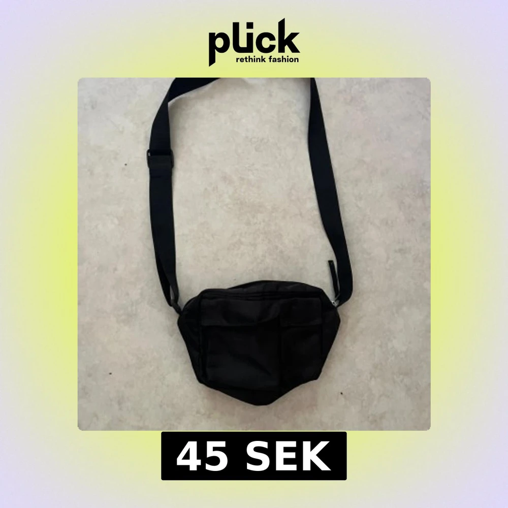 En svart axelväska i syntetmaterial med justerbart band. Väskan har två praktiska fickor framtill med lock och en dragkedja upptill. Perfekt storlek för att bära med sig det viktigaste och enkel att matcha till olika outfits.