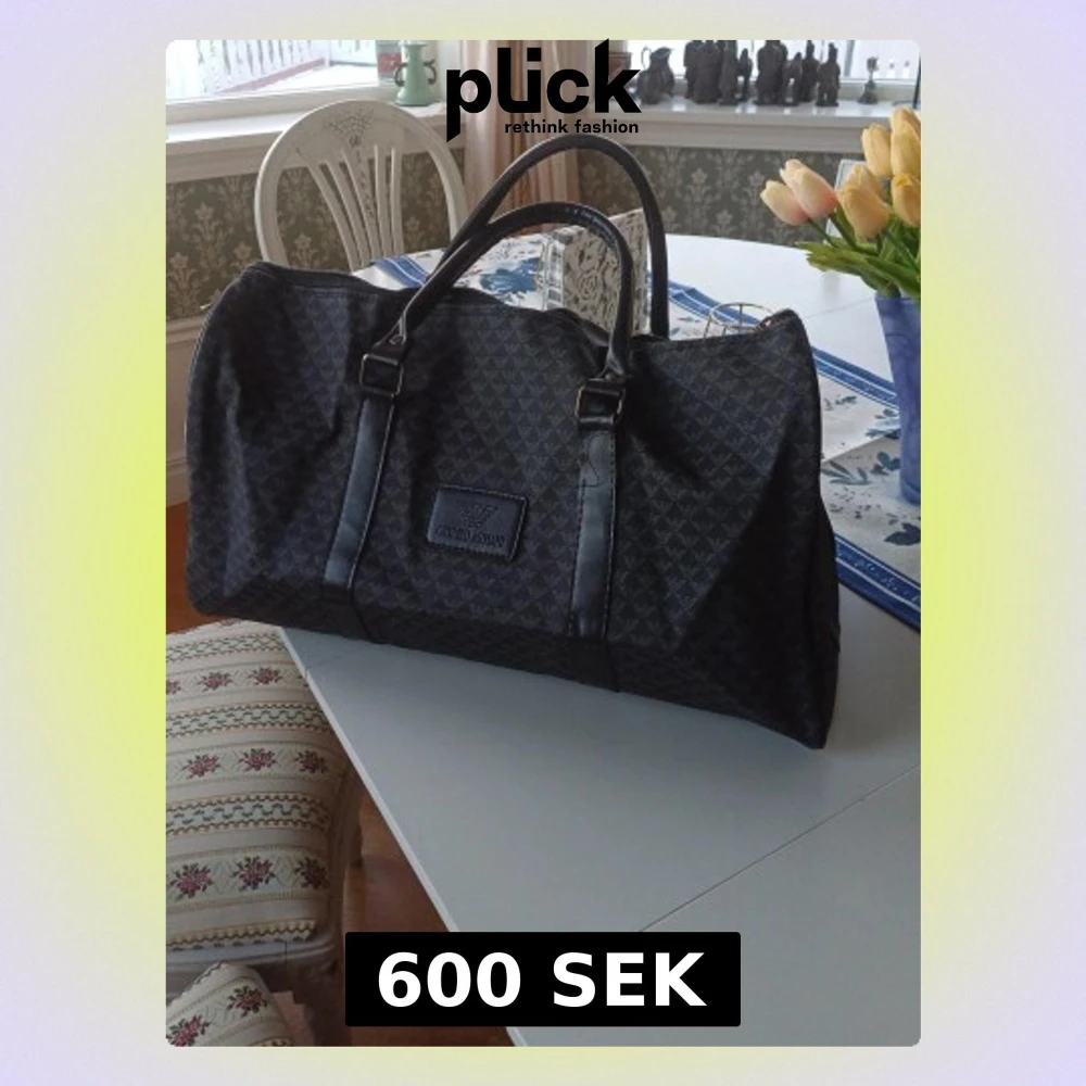 Snygg svart resväska från Giorgio Armani med diskret mönster och dubbla handtag. Väskan har ett klassiskt och stilrent utseende med logotyp framtill. Perfekt för weekendresor och har gott om plats för packning. Allt är i nyskick förutom att en läderbit har gått sönder, därav lågt pris