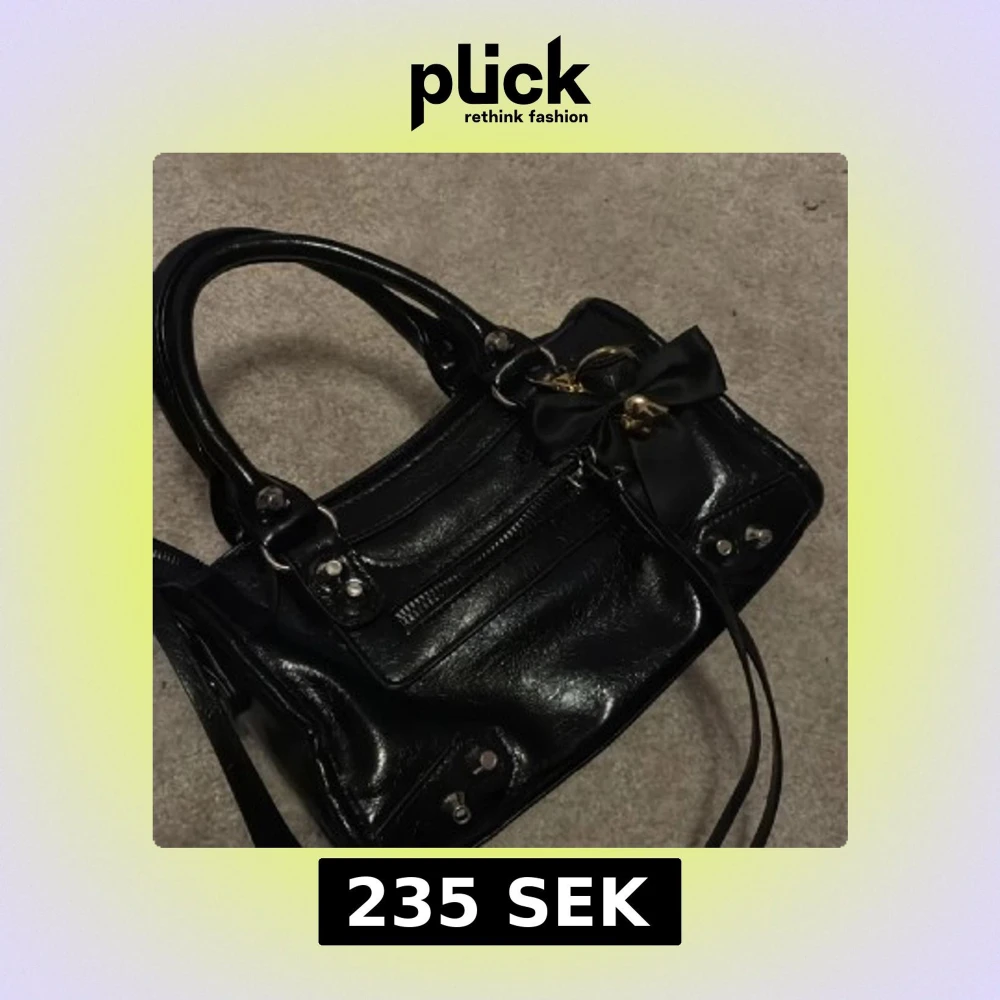 Snygg svart handväska i glansigt skinnliknande material med silverfärgade nitar och dragkedja framtill. Väskan har dubbla handtag, axelrem och en dekorativ svart rosett med guldfärgad hjärtdetalj som hänger framtill. Perfekt för dig som gillar edgy och söt stil.