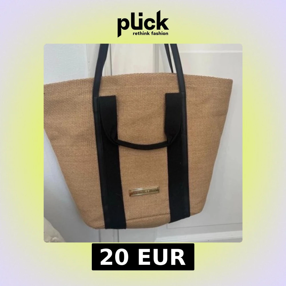 Snygg beige shoppingväska med svarta handtag och detaljer. Perfekt för en dag på stan eller stranden. Väskan har en stilren design med en metallplatta framtill.