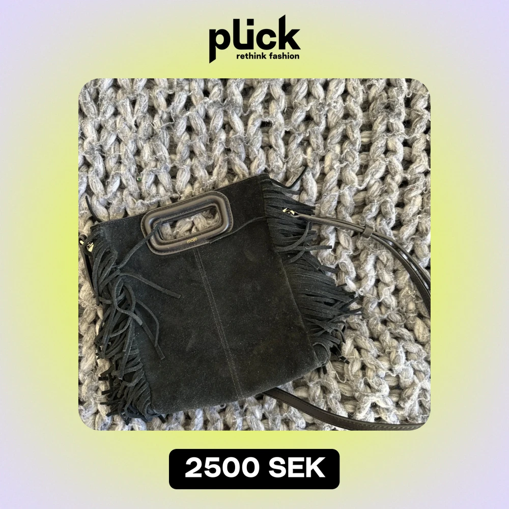 Snygg svart axelväska i mocka från Maje med coola fransdetaljer. Väskan har ett praktiskt handtag och en avtagbar axelrem, perfekt för en trendig look.