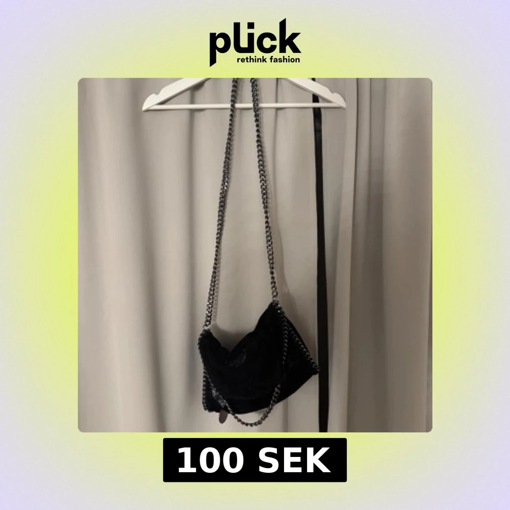 Säljer en svart axelväska med snygg kedjerem och mjukt material. Väskan har en cool design och passar perfekt för dig som vill ha en stilren accessoar med lite edge. Perfekt storlek för det viktigaste!