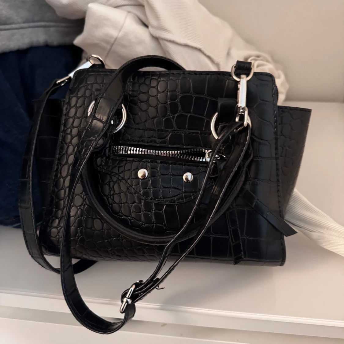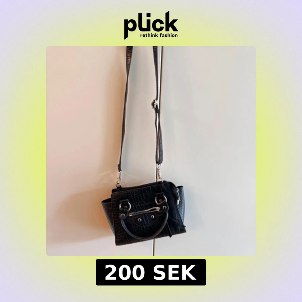 Snygg svart axelväska i croco-mönstrat skinnimitation med både handtag och justerbar axelrem. Väskan har silvriga metalldetaljer och en dragkedja framtill.. Perfekt storlek för det viktigaste.