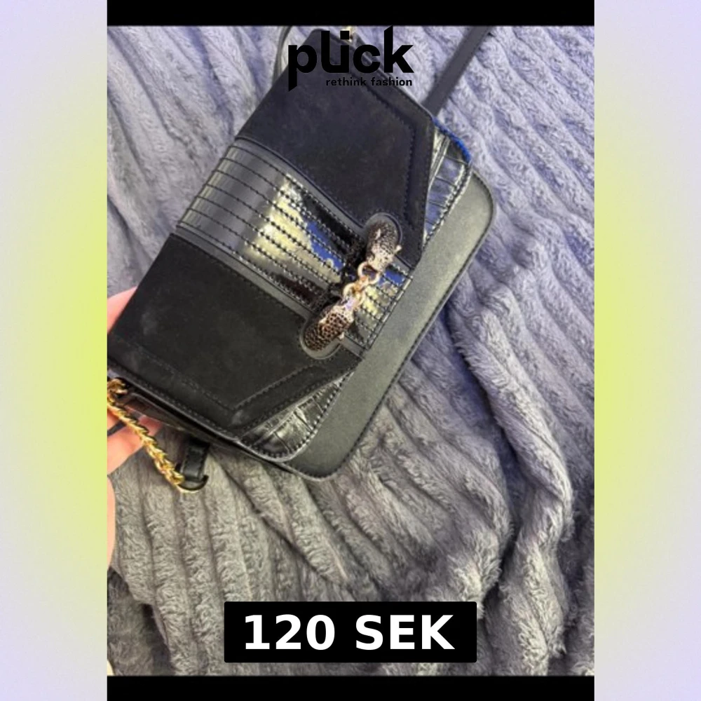 Snygg svart axelväska med guldfärgad kedja och detaljer. Väskan har en mix av mocka och skinn, samt ett coolt mönster på locket. Insidan är rymlig med flera fack, perfekt för mobilen och småsaker. Stilren och trendig design som lyfter din outfit.