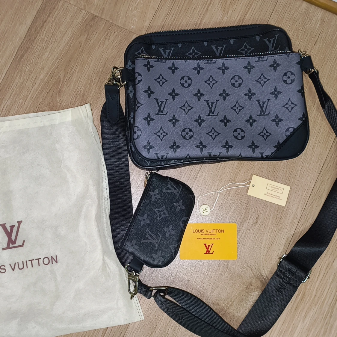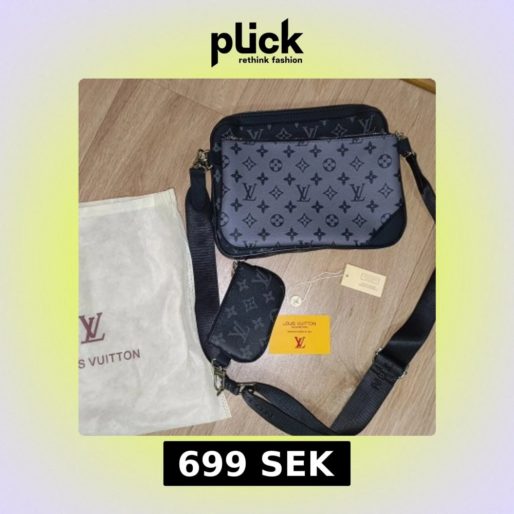 Snygg axelväska i svart och grått med klassiskt monogrammönster. Väskan har justerbar axelrem, flera fack och en mindre avtagbar plånbok. Perfekt för dig som vill ha både stil och funktion.