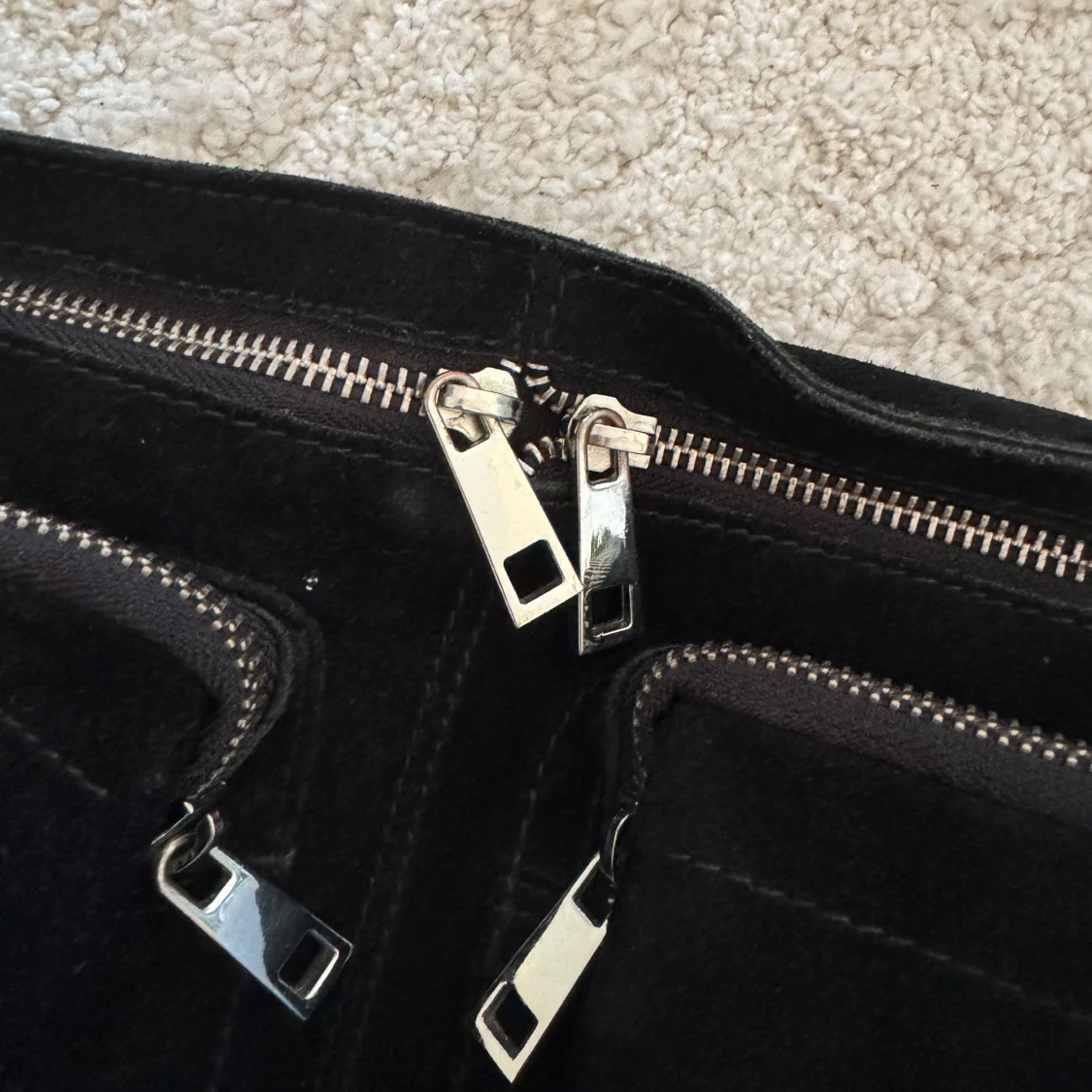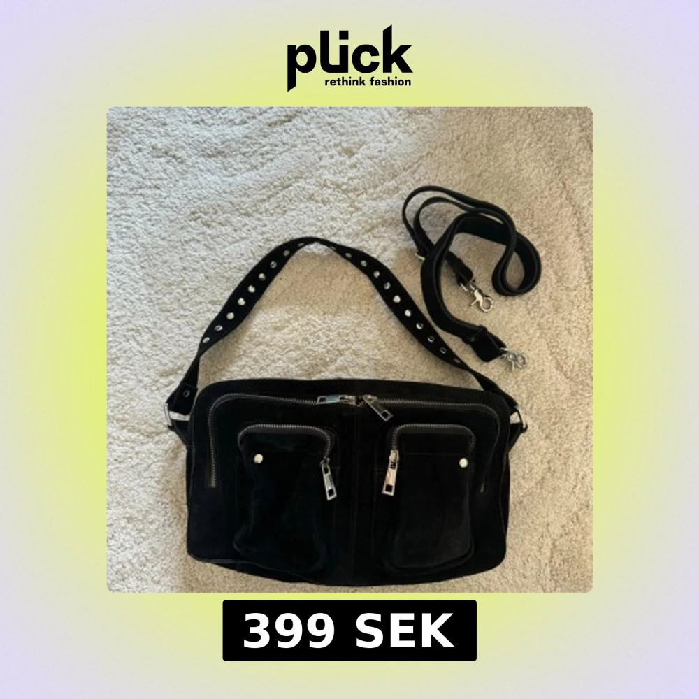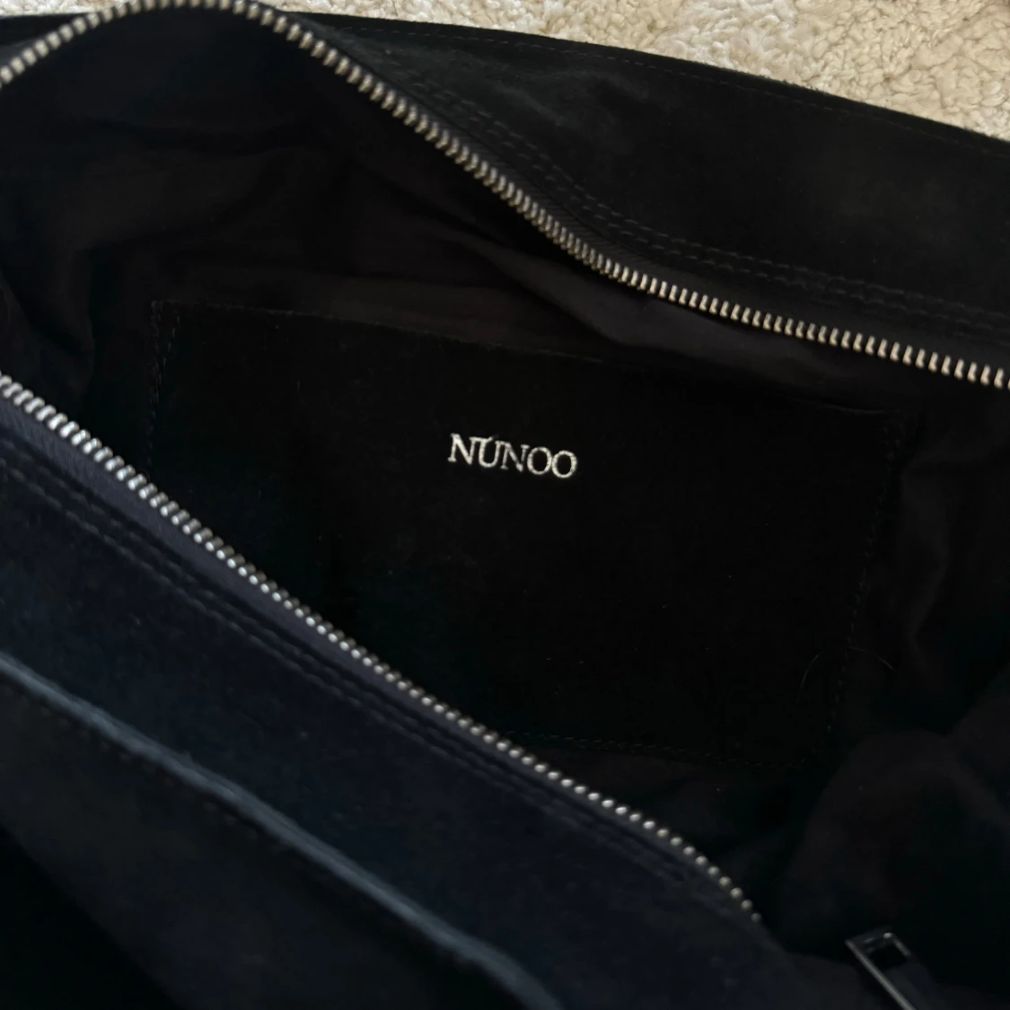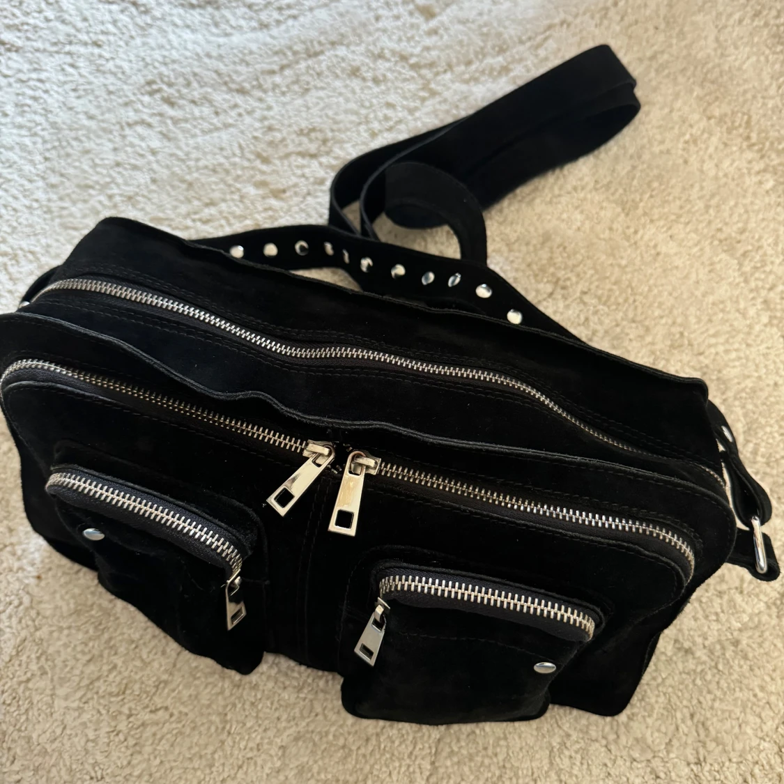 Cool svart axelväska i mocka från Núnoo med flera fickor och silvriga dragkedjor. Väskan har både bred axelrem med nitar och en extra rem, perfekt för att bära crossbody. Snygg och praktisk med detaljer som ger en edgy vibe.Väska från Nunoo modell Ellie, större varianten. Knappt använd, mycket bra skick. Enda skavanken jag kan se är pyttelite missfärgat på 2 av dragkedjorna, var god se sista bilden. Kan användas på axeln eller som crossbody.