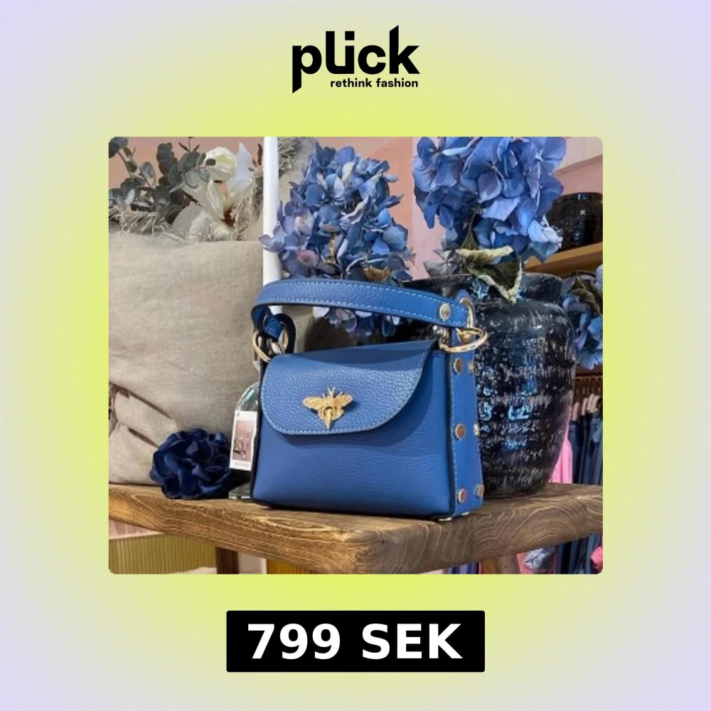 Snygg blå axelväska i skinn med guldfärgad kedja och dekorativt bi på locket. Väskan har både handtag och axelrem, samt nitar på sidorna. Perfekt storlek för det viktigaste och ger en trendig vibe till din outfit.