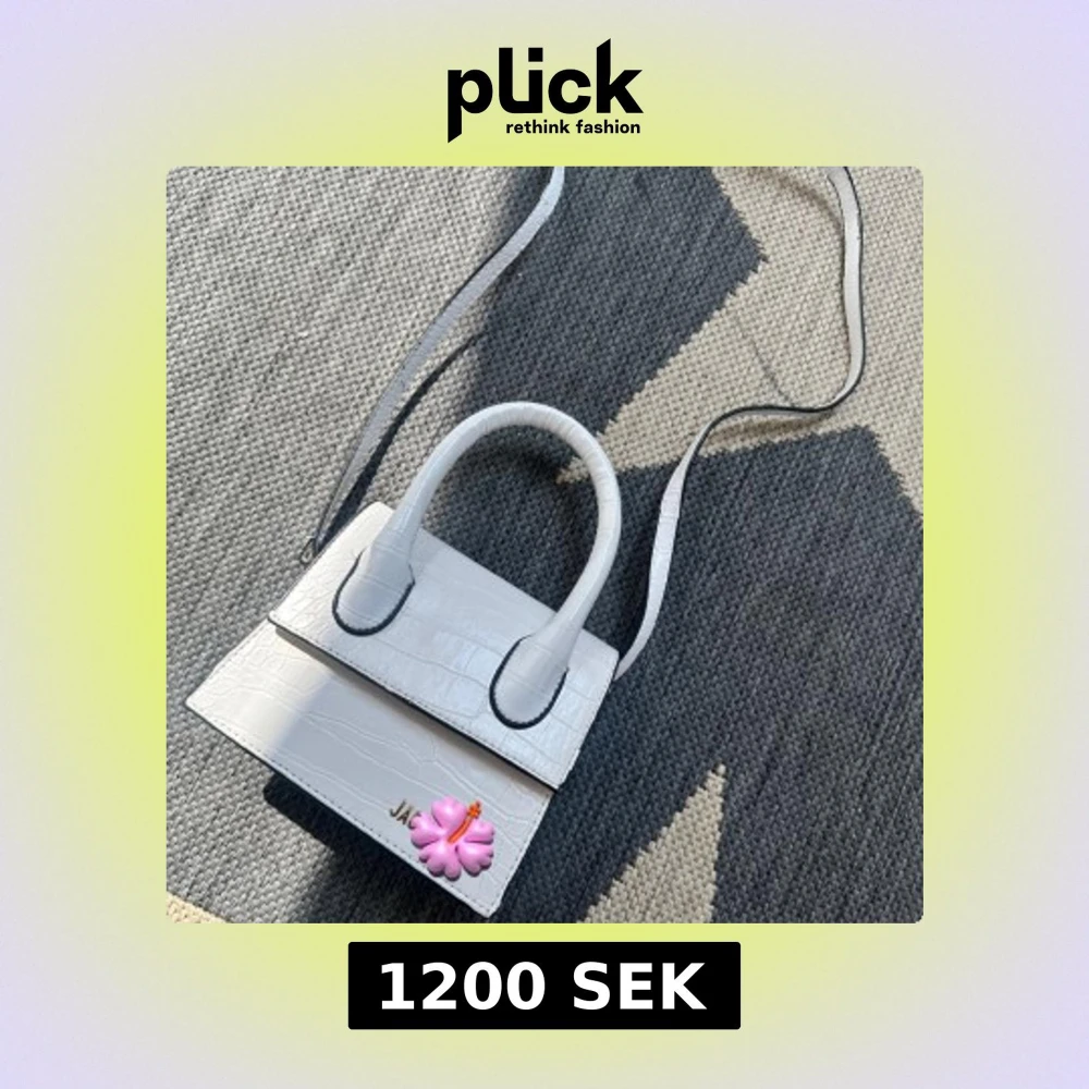 Säljer en stilren vit axelväska från Jacquemus med krokopräglat mönster. Väskan har både handtag och lång axelrem, perfekt för att bära på olika sätt. Snygg och kompakt design med silverfärgad logga framtill.