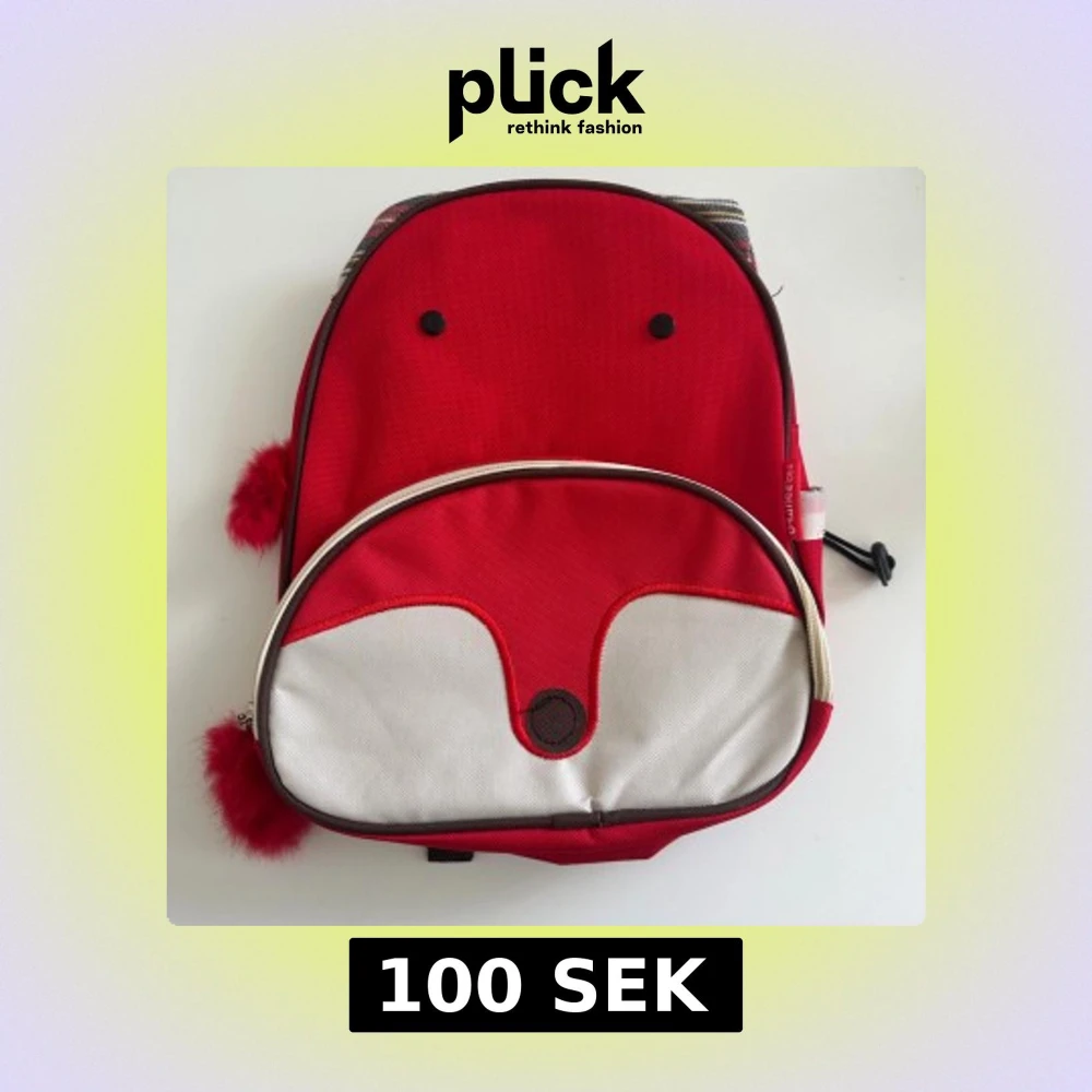 Röd ryggsäck med rävmotiv och fluffiga detaljer