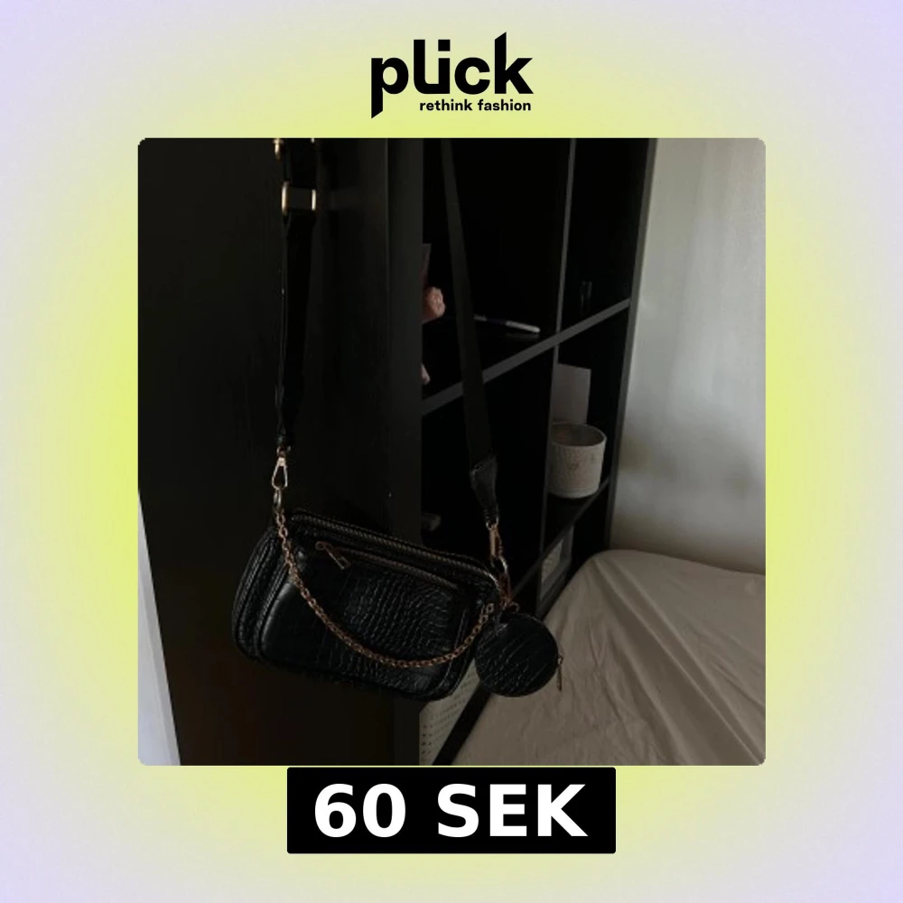 Snygg svart axelväska med croco-mönster och guldfärgad kedja. Väskan har flera dragkedjor och en rund liten plånbok som hänger på sidan. Justerbar axelrem i textil och detaljer i skinnimitation ger en cool vibe.
