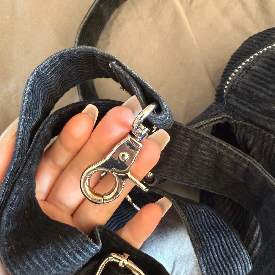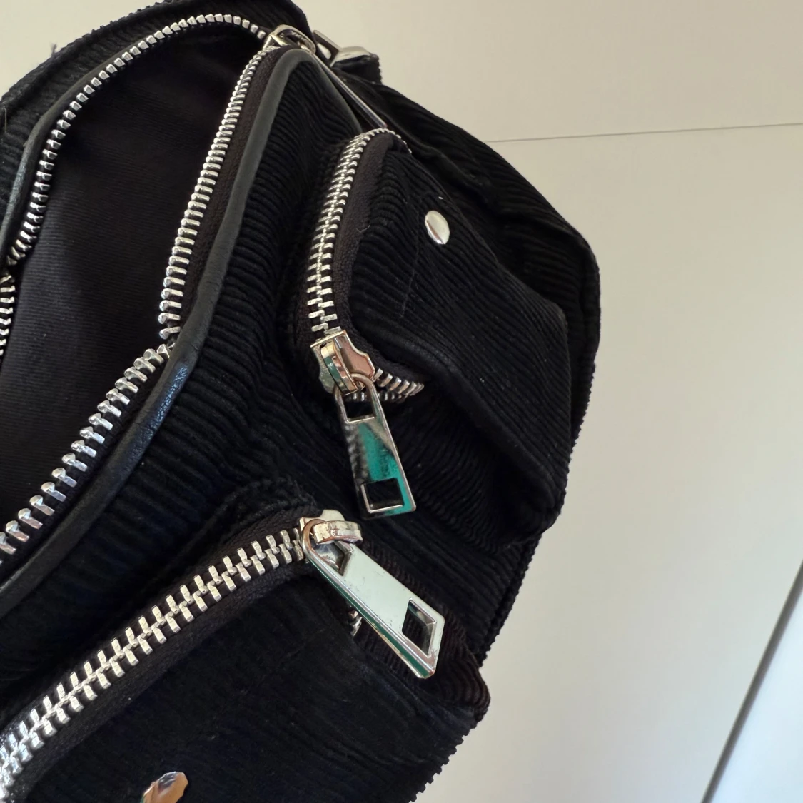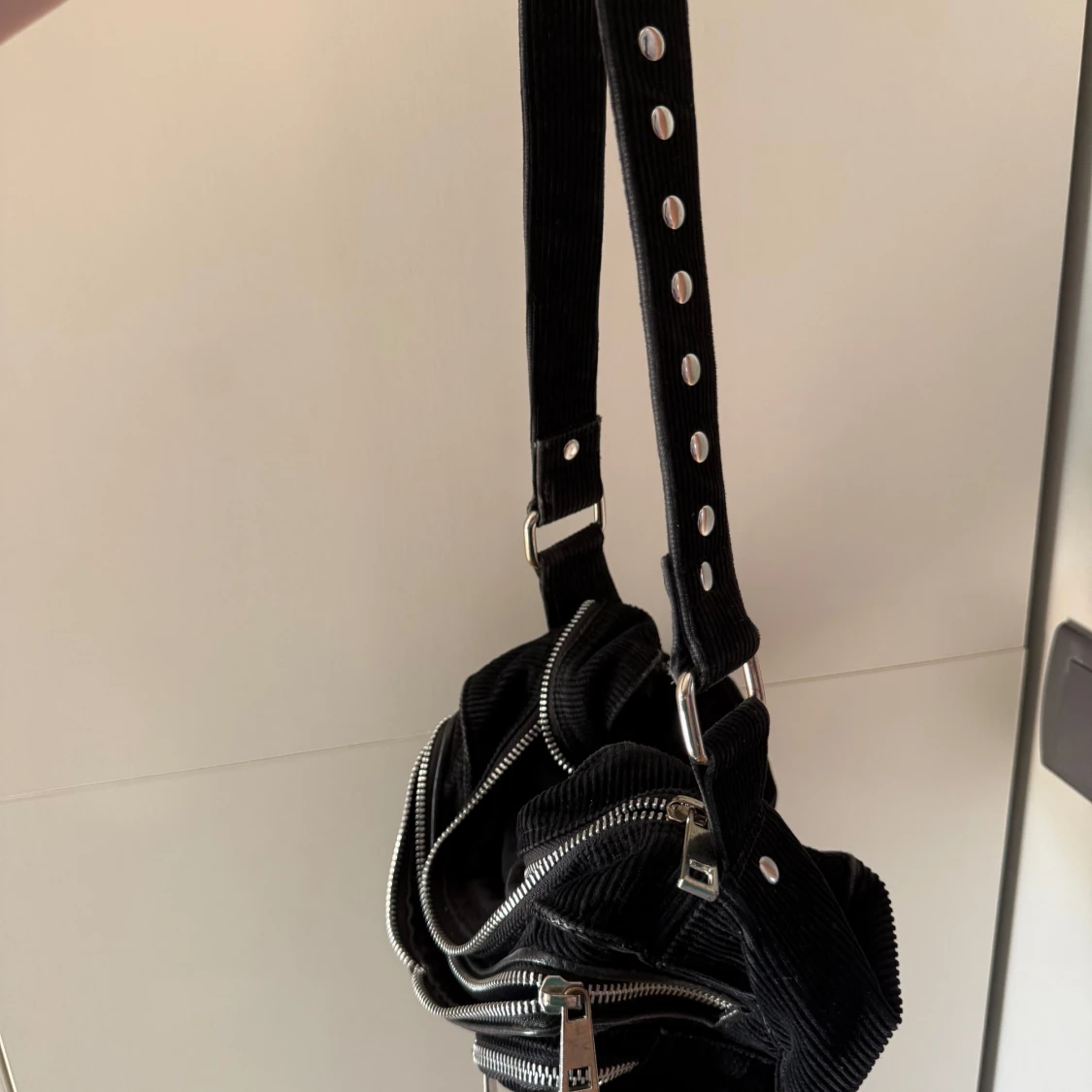 Cool svart axelväska i manchester med bred justerbar rem och flera silvriga dragkedjor. Väskan har flera fack och detaljer i metall, perfekt för dig som gillar en edgy och unik stil. Rymmer allt du behöver till vardagen.