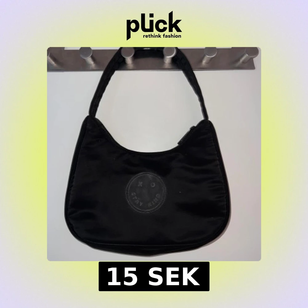 Snygg svart axelväska från Stay Kind med broderad smiley och texten 'XO Stay Kind' på framsidan. Väskan har en mjuk, lätt glansig yta och stängs med dragkedja. Perfekt storlek för mobilen, plånboken och lite till.