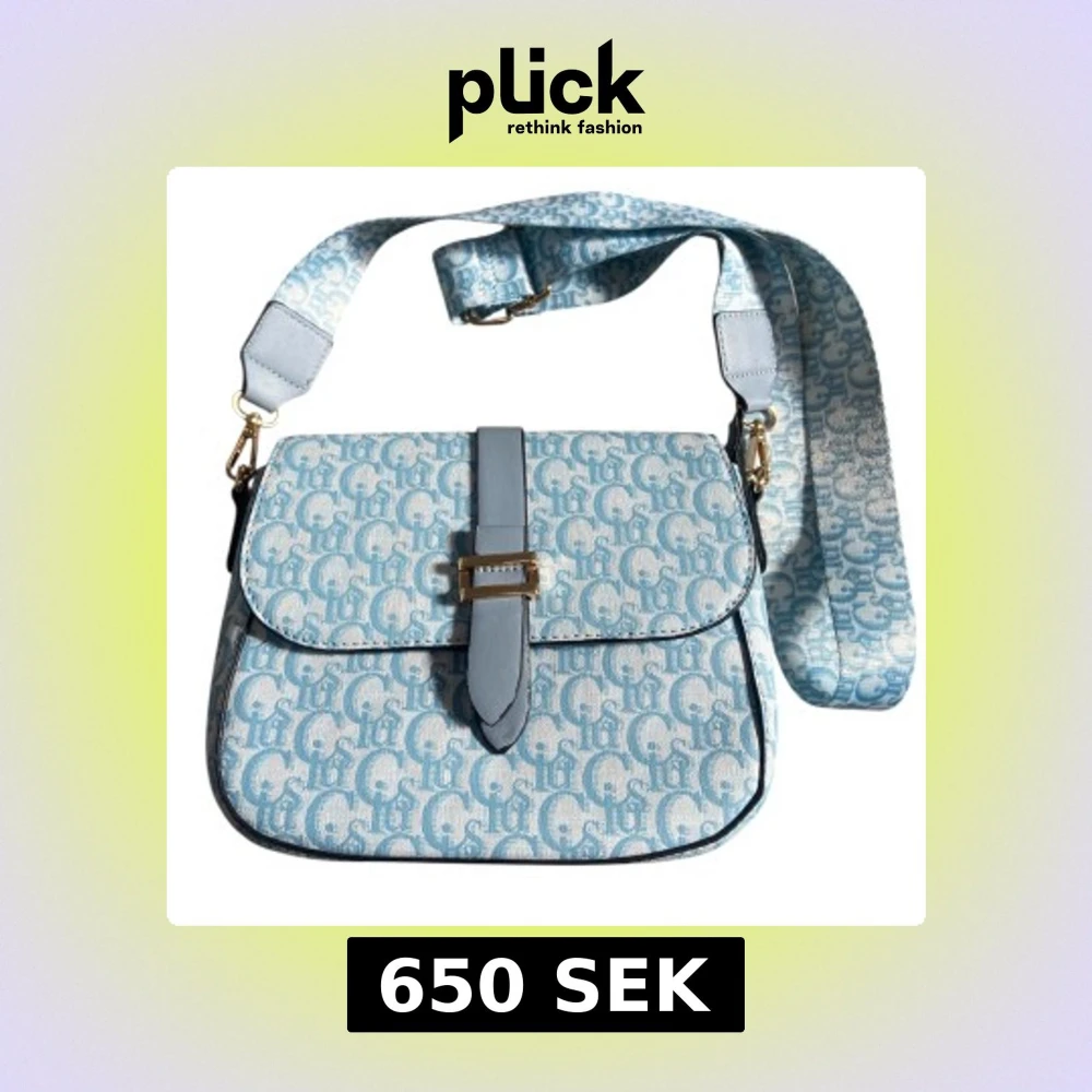 Snygg axelväska i ljusblått och vitt med tydligt monogrammönster. Väskan har bred justerbar axelrem, guldfärgade detaljer och flera fack med dragkedja. Materialet är en mix av syntet och textil, perfekt för dig som gillar statement-accessoarer.
