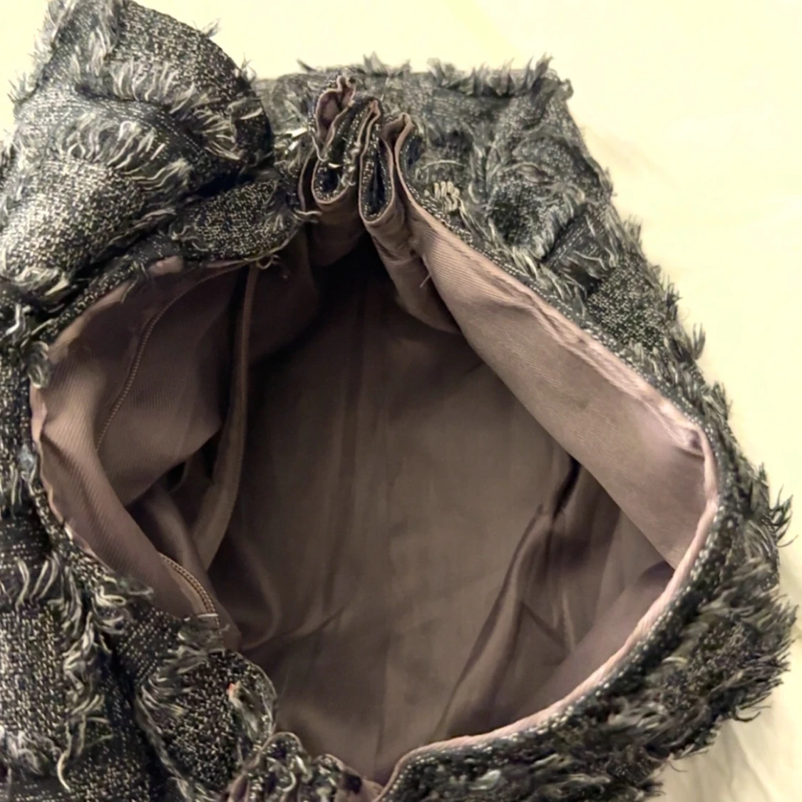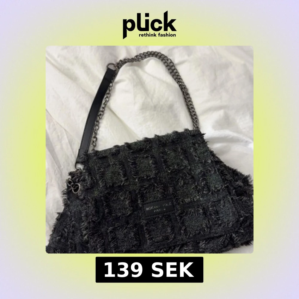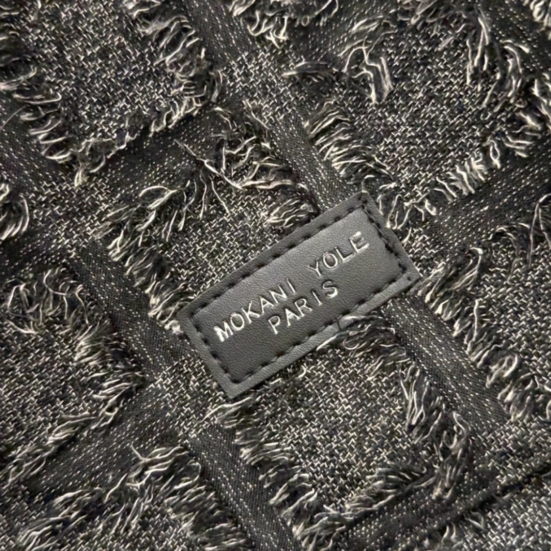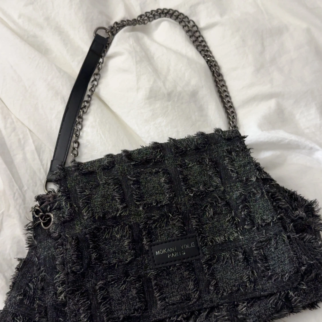 Säljer en svart axelväska från Mokani Yole Paris med rutigt, fransigt tyg och kedjerem med läderdetalj. Väskan har en cool, edgy look och är perfekt för dig som gillar unika accessoarer. Rymmer allt du behöver till vardags och har ett stort huvudfack.