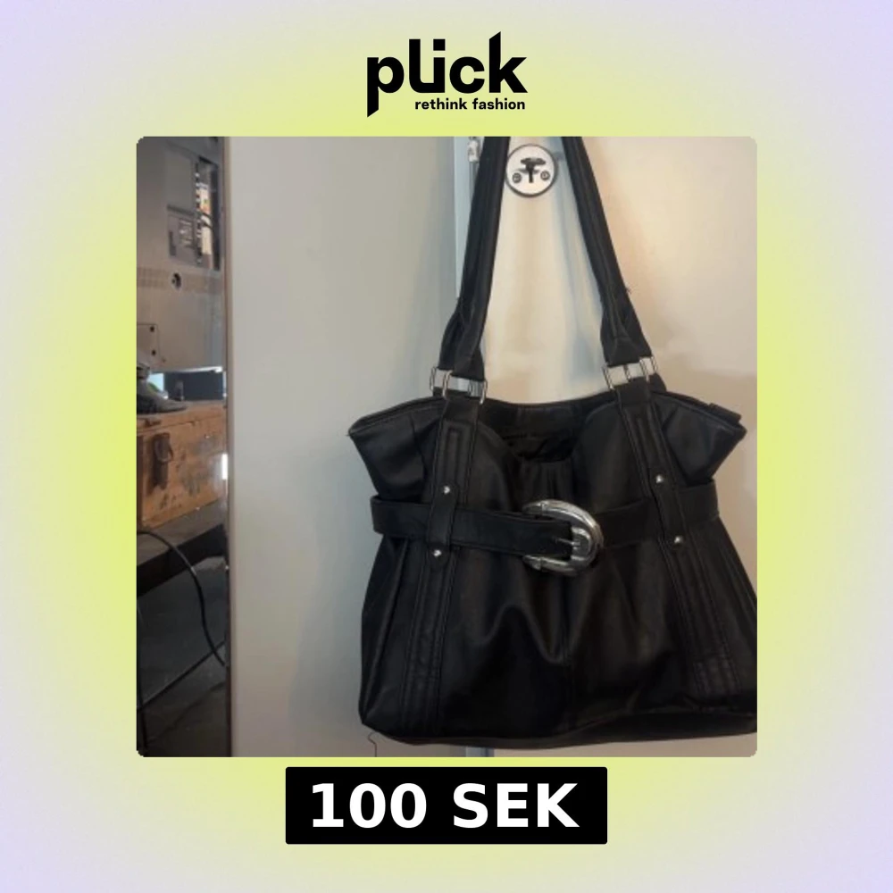 Snygg svart handväska med breda axelband och coolt bälte med stor silverfärgad spänne framtill. Perfekt storlek för att få plats med allt du behöver, kommer tyvärr inte till användning💕💕