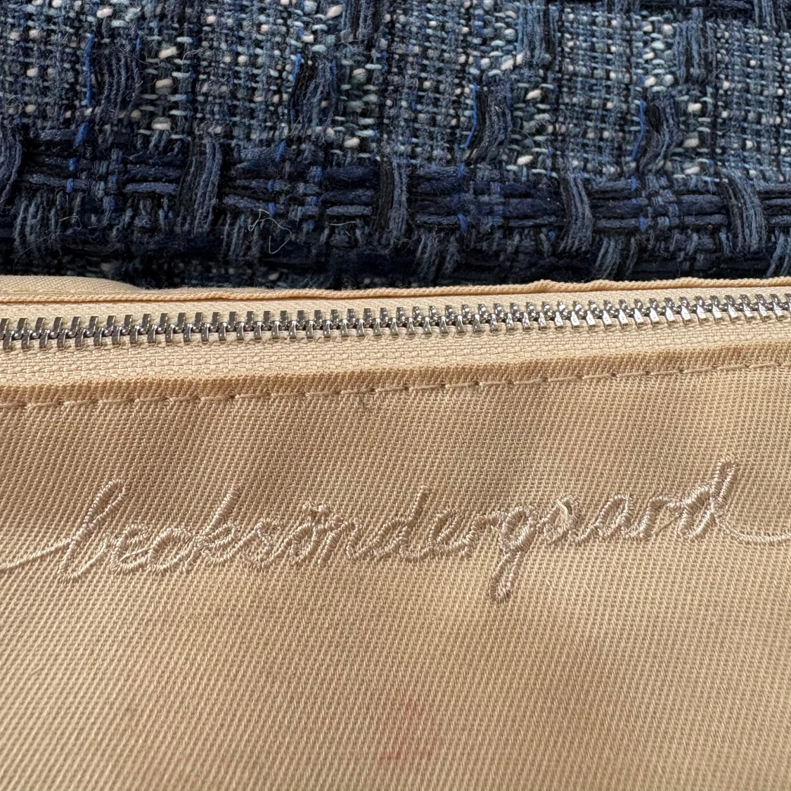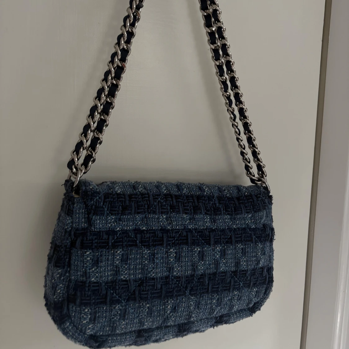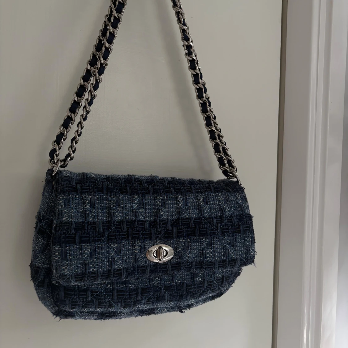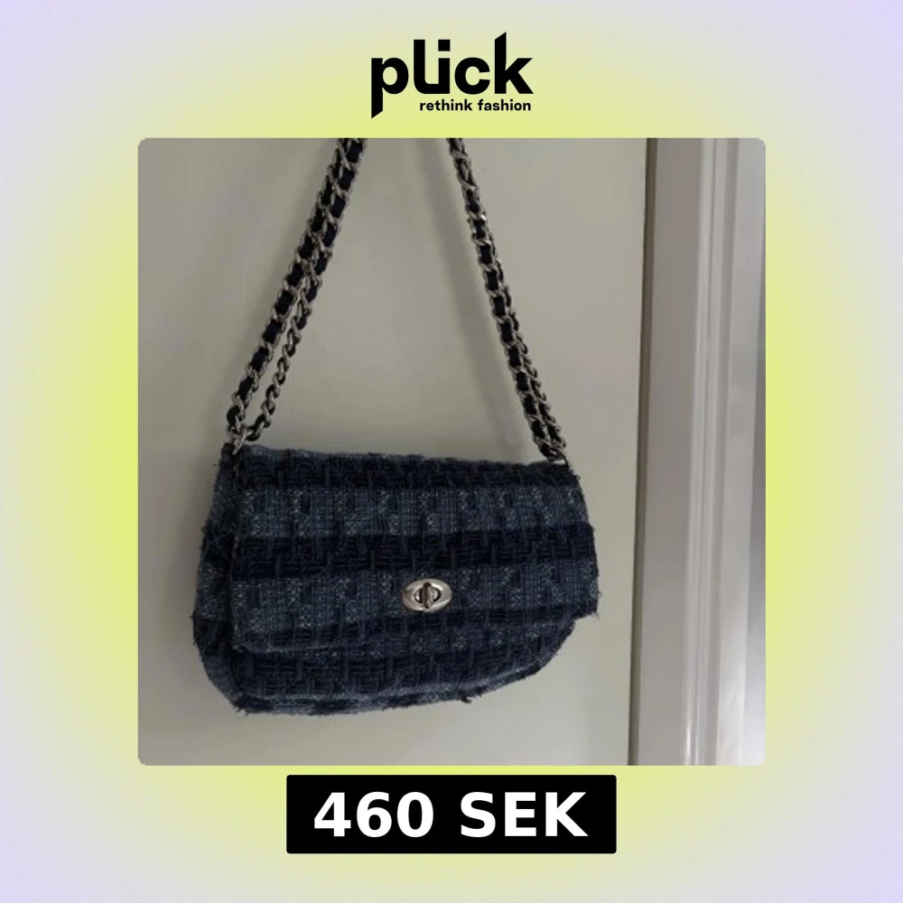 Snygg axelväska från Becksöndergaard i mörkblått och ljusblått rutigt tyg. Väskan har en kedjerem med inslag av tyg och ett klassiskt vridlås i silver. Perfekt storlek för det viktigaste och ger en cool, trendig vibe till din outfit.