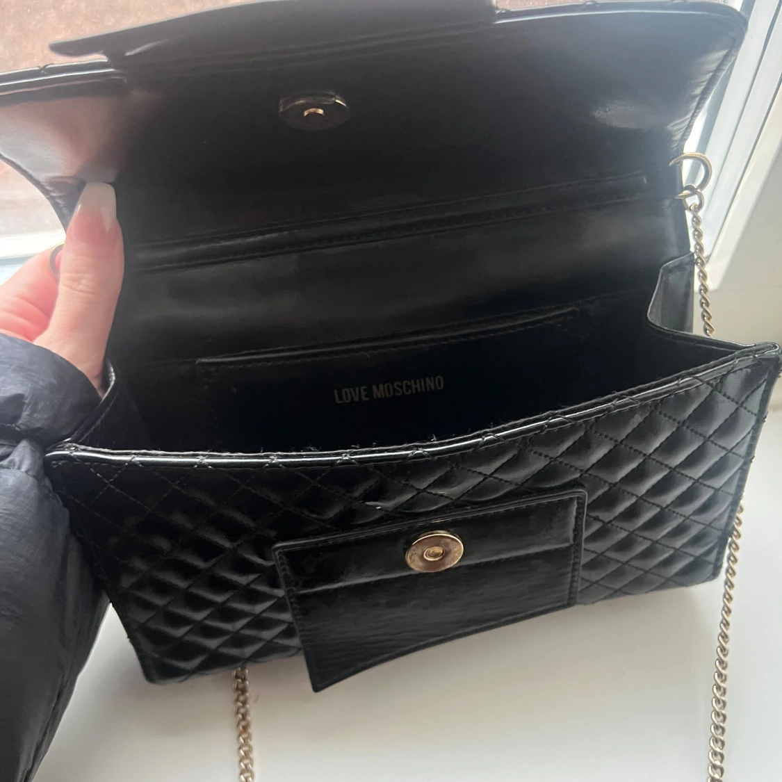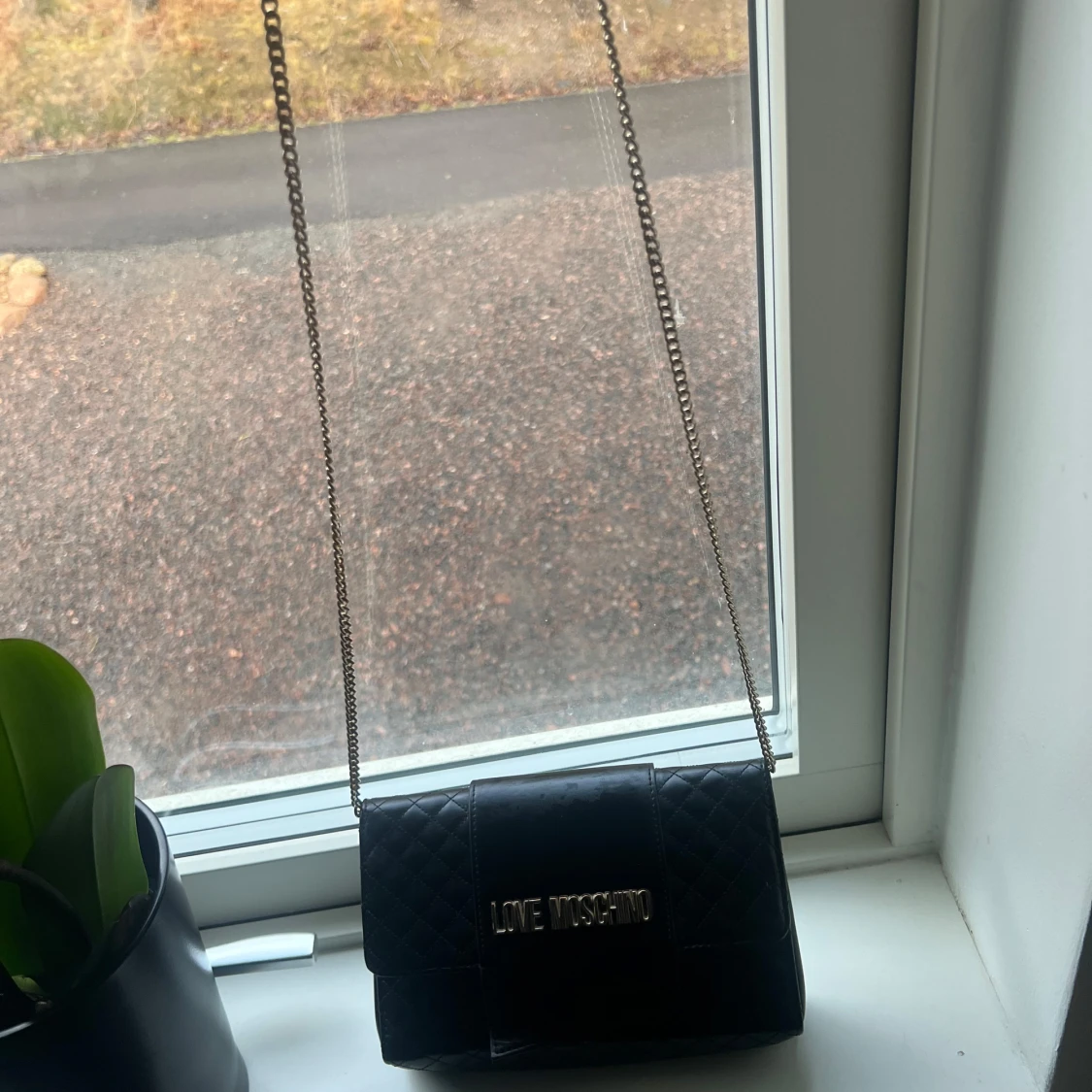 Snygg svart axelväska från Love Moschino med quiltad design och kedjeaxelrem. Väskan har en elegant logotypdetalj på framsidan och är perfekt för att ge din outfit en stilfull touch.