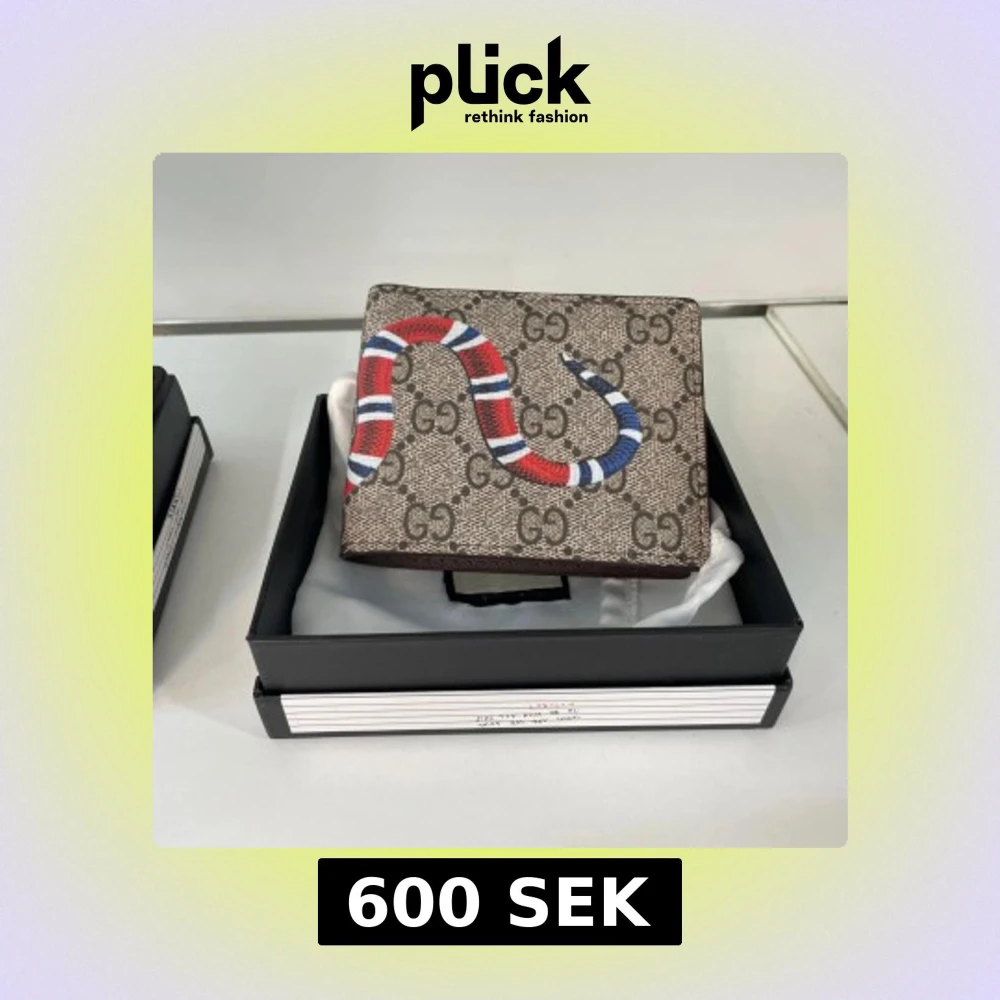 Säljer en snygg plånbok med klassiskt GG-mönster i beige och brunt. Plånboken har en cool röd, blå och vit orm på framsidan som ger en unik touch. Perfekt accessoar för dig som vill sticka ut med stil.